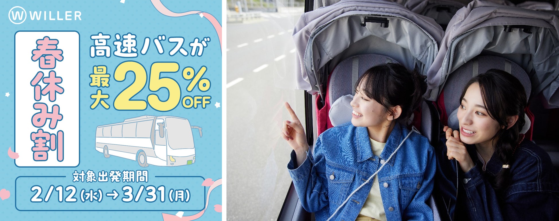 WILLER MARKETING株式会社(本社:大阪府大阪市、代表取締役社長:辻本 宗男、以下「WILLER」)は、学生の春休み旅行を応援するため、高速バス「WILLER EXPRESS」の『春休み割プラン』の販売を、予約サイト「WILLER TRAVEL」(特設ページ:https://travel.willer.co.jp/campaign/area)にて本日1月21日(火)より開始します。