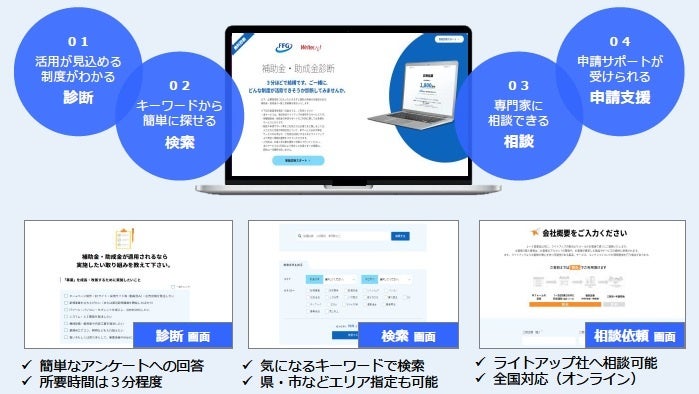 本機能は、株式会社ライトアップ(代表取締役社長 白石 崇、以下「ライトアップ社」)が提供する補助金・助成金自動診断システム「Jシステム」と連携した機能です。利用者はオンライン上で自社で活用が見込める補助金・助成金を数分程度で把握でき、希望者はオンライン上でライトアップ社に相談や各種申請手続きのサポートを受けることができます。