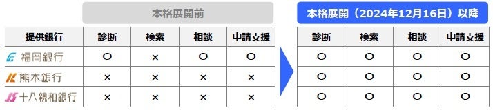 株式会社ふくおかフィナンシャルグループ(取締役社長 五島 久)は、事業者さま向け経営サポートサービス「BIZSHIP」(以下「BIZSHIP」)において、福岡銀行で試行提供していた「補助金・助成金診断」機能を、より利便性を高めるとともに熊本銀行と十八親和銀行でも提供を開始したことをお知らせします。