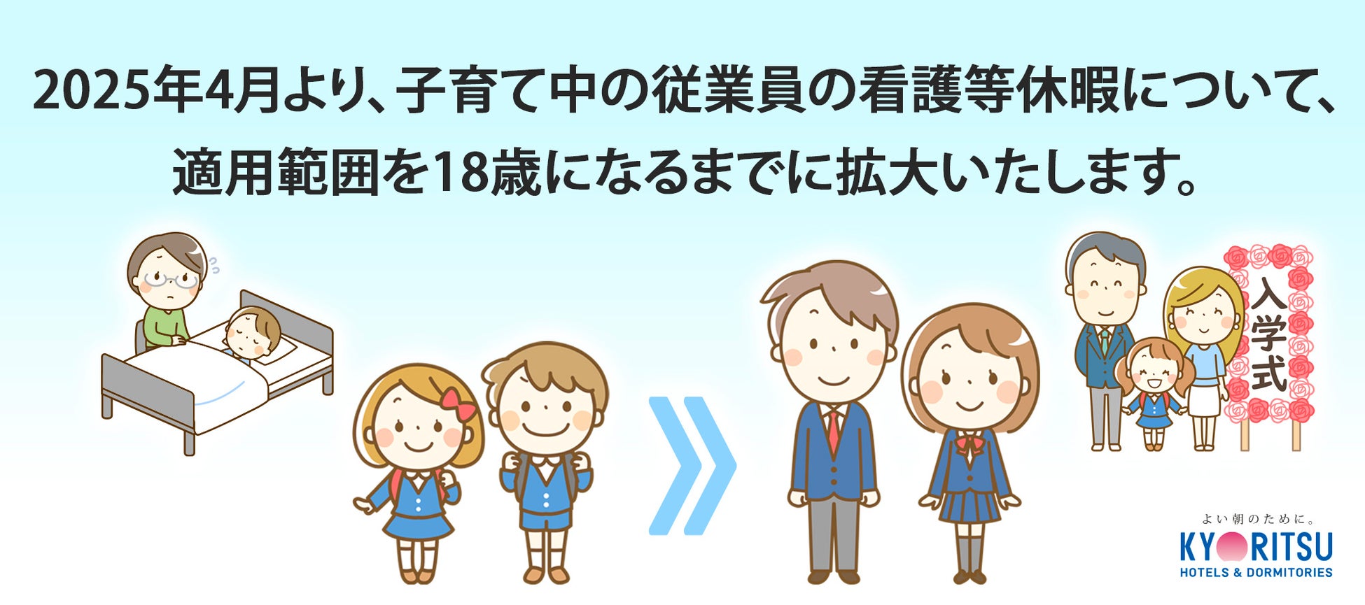 全国に展開する学生寮・社員寮「ドーミー」、ホテル「ドーミーイン」・「共立リゾート」、首都圏を中心とした高齢者向け住宅「ドーミーシニア」を運営する株式会社共立メンテナンス(以下、共立メンテナンス/代表取締役社長:中村 幸治/本社:東京都千代田区)は、2025年4月から段階的に施行される「育児・介護休業法」の改正に伴い、従業員(正社員・契約社員・パート社員)の子の看護等休暇について、「小学校3年生修了まで」とされた範囲を超えて、当社では「18歳になるまで」に拡大いたします。
