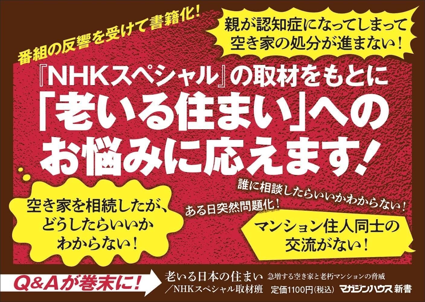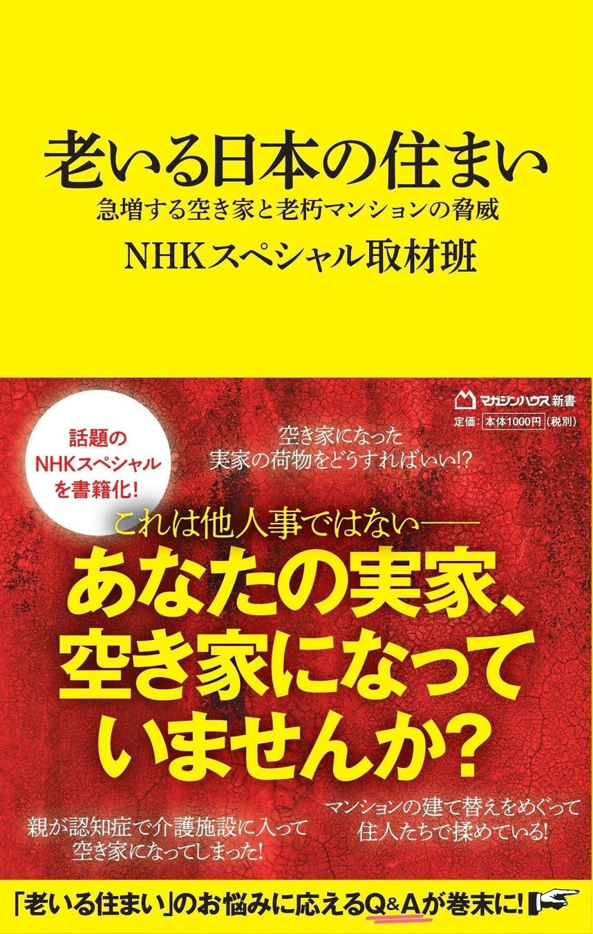 株式会社マガジンハウス(本社:東京都中央区、代表取締役社長:鉄尾周一)は、NHKスペシャルのシリーズ『老いる日本の〝住まい″』の「空き家1000万戸の衝撃」「マンションに迫る2つの〝老い″」の2回を書籍化し、2024年1月25日にマガジンハウス新書『老いる日本の住まい』として全国の書店・インターネット書店にて発売いたします。