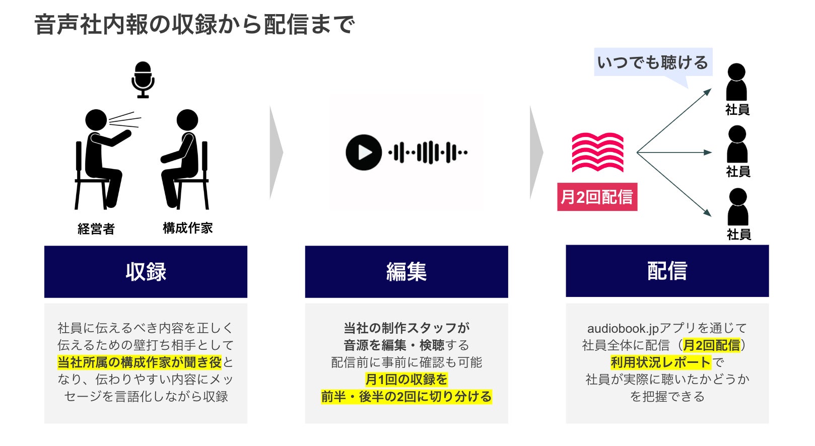 また、音声社内報と併せてオーディオブックが聴き放題の「audiobook.jp 法人版」も利用可能です。