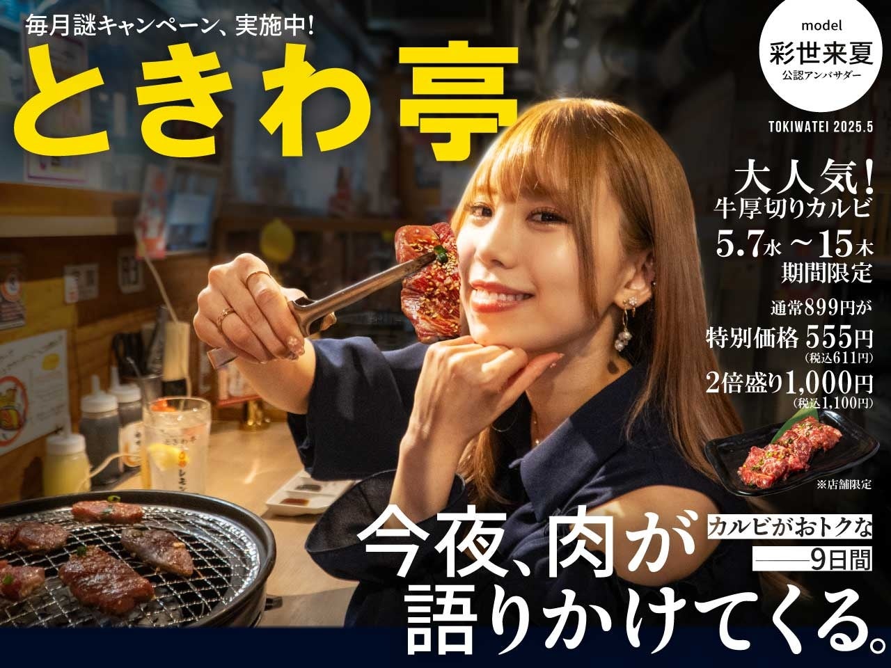 GOSSO株式会社(本社:東京都渋谷区、代表取締役:藤田建、以下 当社)は、「0秒レモンサワー® 仙台ホルモン焼肉酒場 ときわ亭」(一部店舗を除く)で、5月7日(水)~5月15日(木)の期間限定で、人気の「牛厚切りカルビ」を通常899円のところ555円、2倍盛りを1,000円(いずれも税抜)の特別価格で提供するキャンペーン『今夜、肉が語りかけてくる~カルビがおトクな9日間~』を開催いたします。https://store.zero-tokiwa.com/