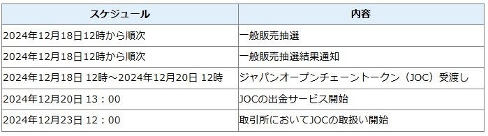 本IEOの一般販売は2024年12月17日に購入申込受付を終了しました。一般販売の抽選は12月18日に実施され、抽選結果は12月18日から順次通知されます。また、12月23日12:00にはBitTrade取引所でジャパンオープンチェーントークン(JOC)の取扱いを開始する予定です。