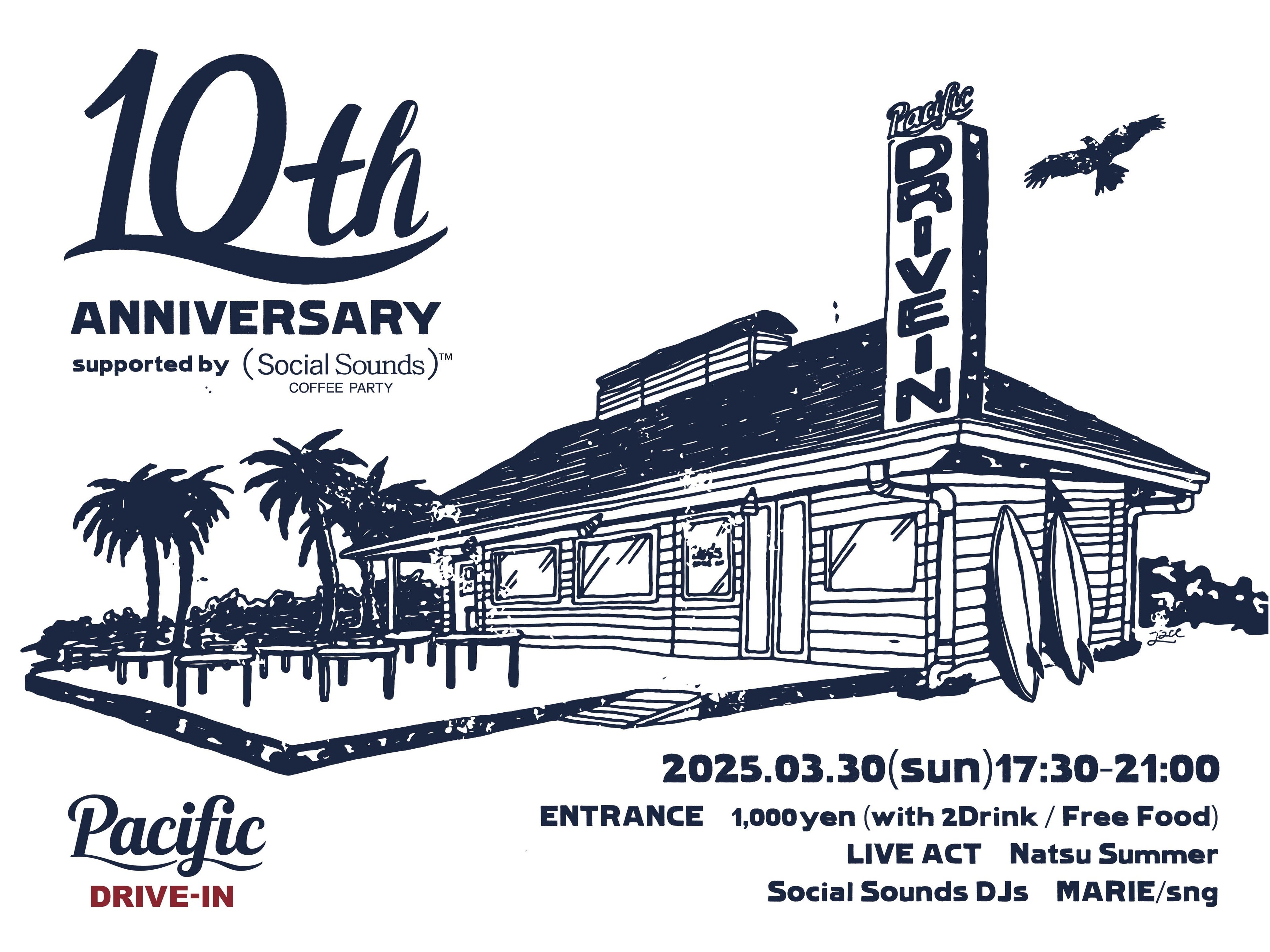 ドライブインカフェ〈Pacific DRIVE-IN 七里ヶ浜〉が、「10th ANNIVERSARY PARTY supported by Social Sounds™」を3月30日(日)に開催。