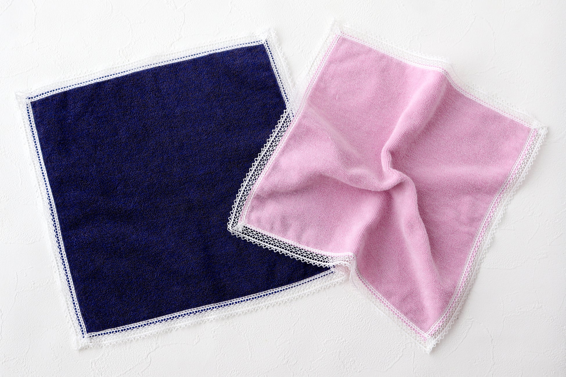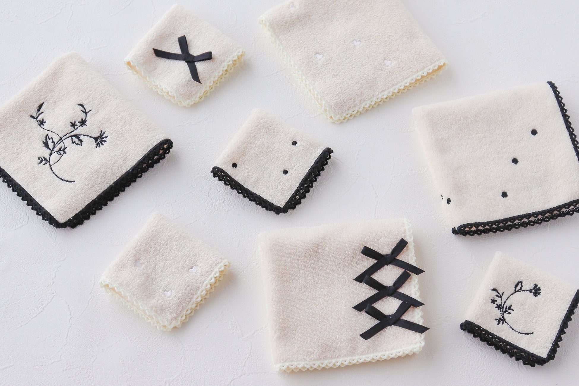 パイルの毛足を短めに仕上げているので、パイルがくたっとせず、タオルなのに毛羽が少なく滑らかな肌触りとなります。ビジネスシーンはもちろん、ちょっと贅沢なランチなどの場にも馴染むよう、レースやドット柄などシンプルで洗練された上品なデザインとなっております。長く愛用できる上質なタオルハンカチを目指しました。