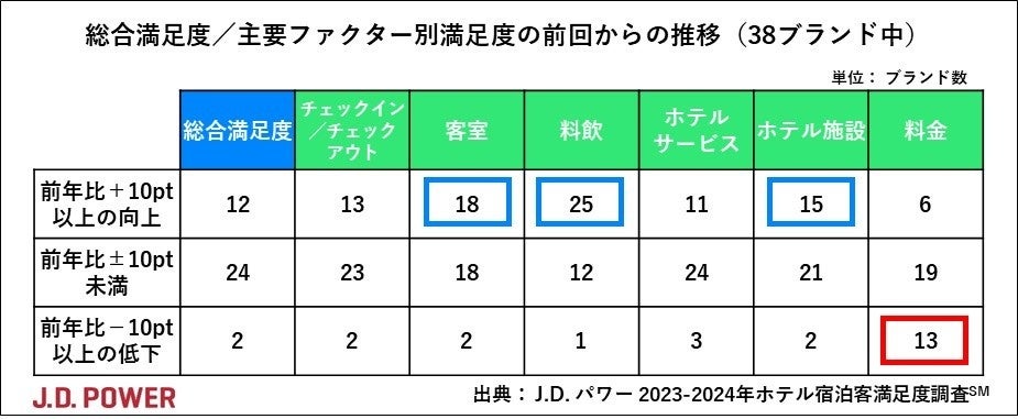 しかし、料金上昇が満足度全体に与える影響は限定的であった。前回調査では宿泊料金の大幅な上昇が主因となり、総合的な宿泊客満足度が大きく低下したが、今回調査では38ブランド中12ブランドで10pt以上の満足度向上が見られ、10pt以上低下したのは2ブランドのみだった。
