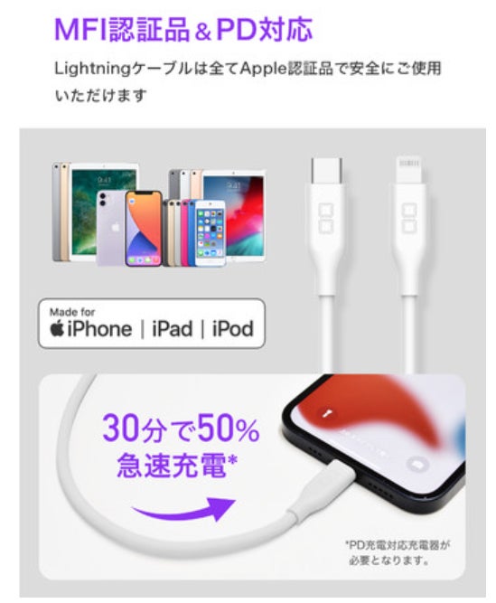 Lightning搭載ケーブルはApple MFi認証を取得しているため、iPhoneやiPad等に最適に動作し、OSのアップデート後も安心してご使用いただけます。