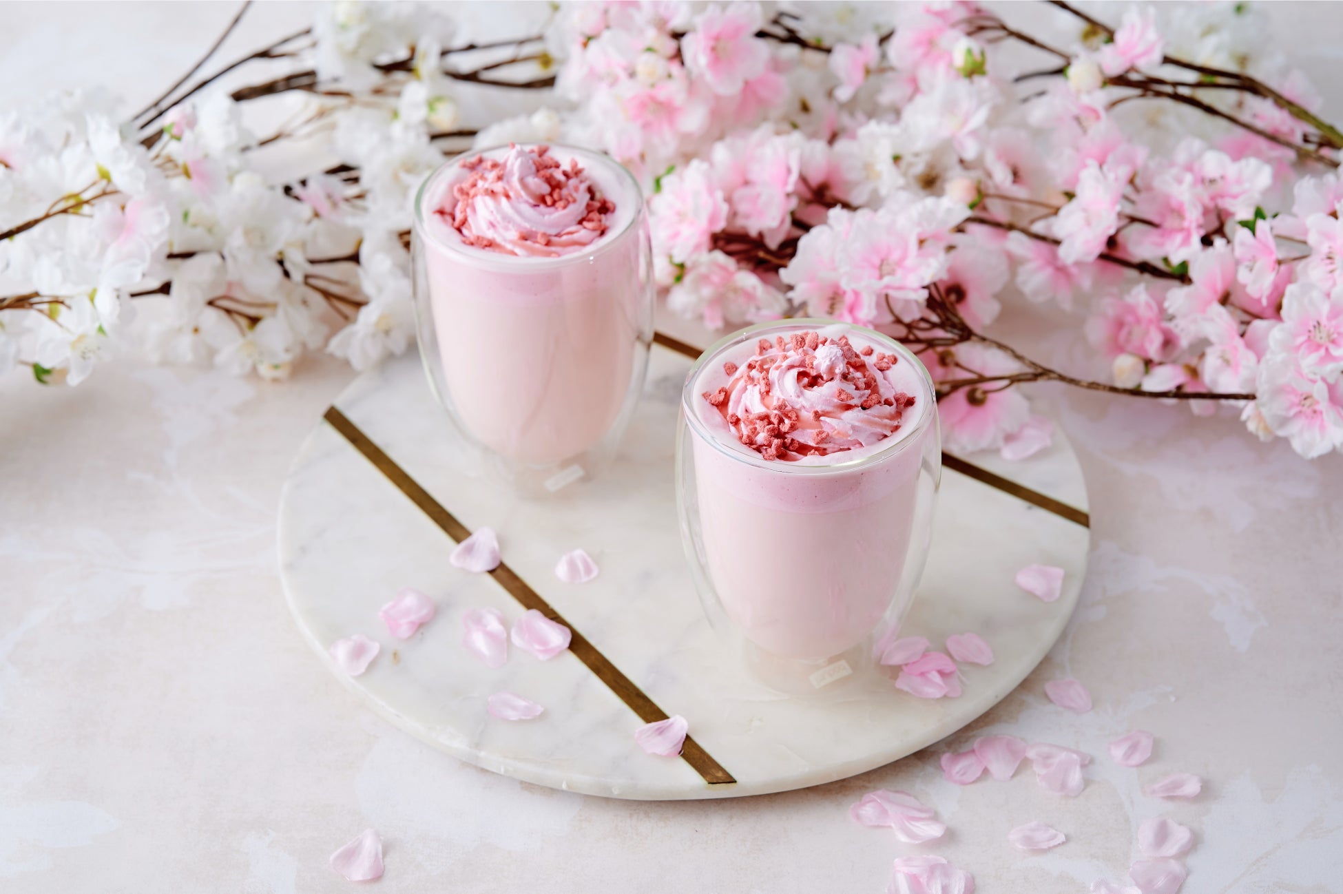 トップに桜ホイップと桜クランチをあしらい、優しく桜が香る春らしい一杯に仕上げました。