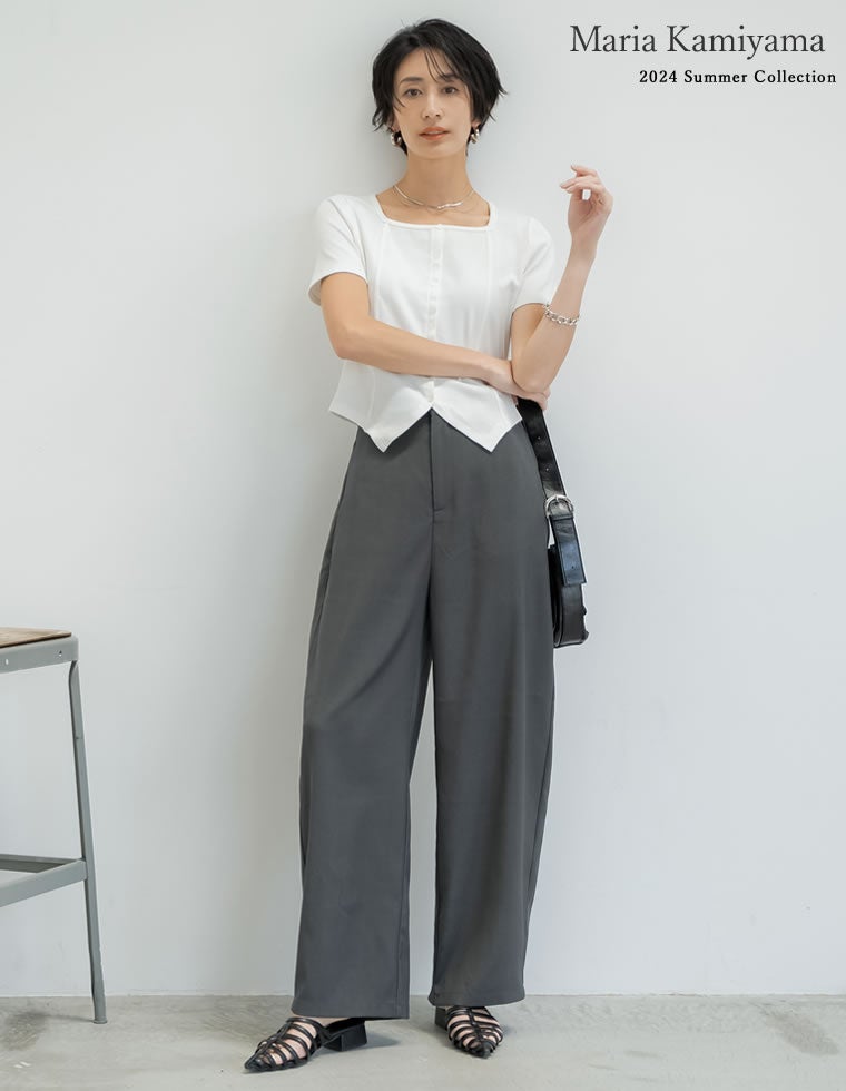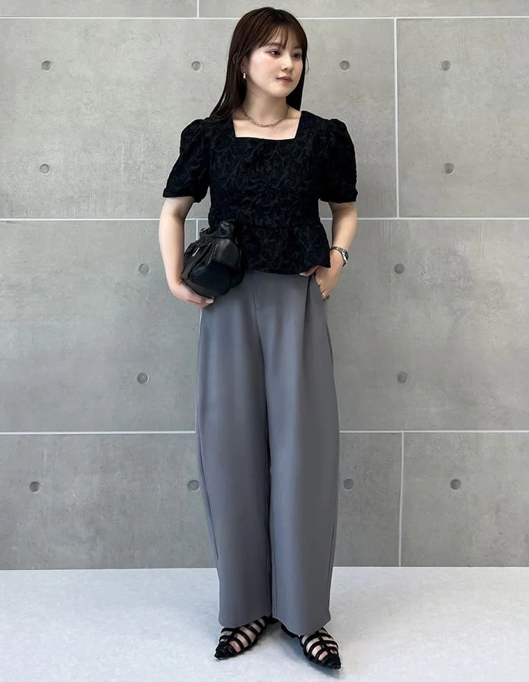 低身長でもスタイルアップできるように、コンパクトめな丈感を選びます◎ 骨格ストレートさんは、首の詰まったトップスよりも、このようなスクエアネックなどすっきりとしたデザインがおすすめ!
