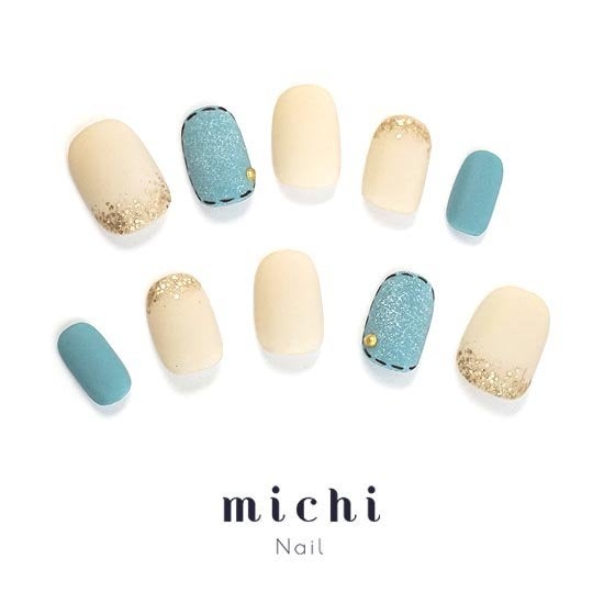 肌なじみの良いナチュラルカラーとブルーのデニムネイル。グリッターのキラキラ感と、ステッチ風アートが魅力です。ゴールドのスタッズがポイントでよりデニムっぽさを出しています。