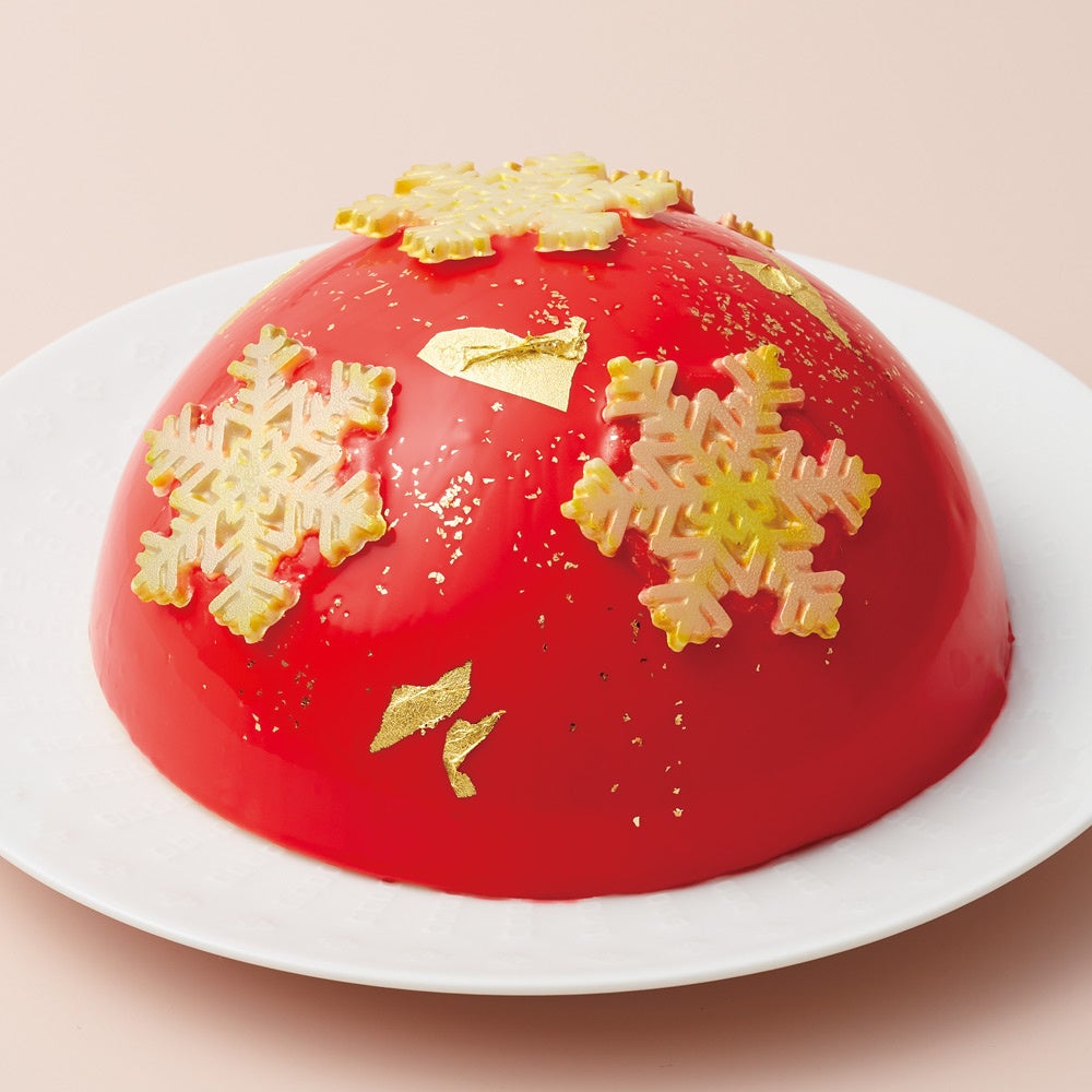 華やかなドレスのビジューのように「Flocon(雪の結晶)」が輝くドーム型ケーキ。爽やかなライム風味のホワイトチョコレートムースで、イチゴのコンポートやライムとパッションフルーツ風味のビスキュイを包みました。