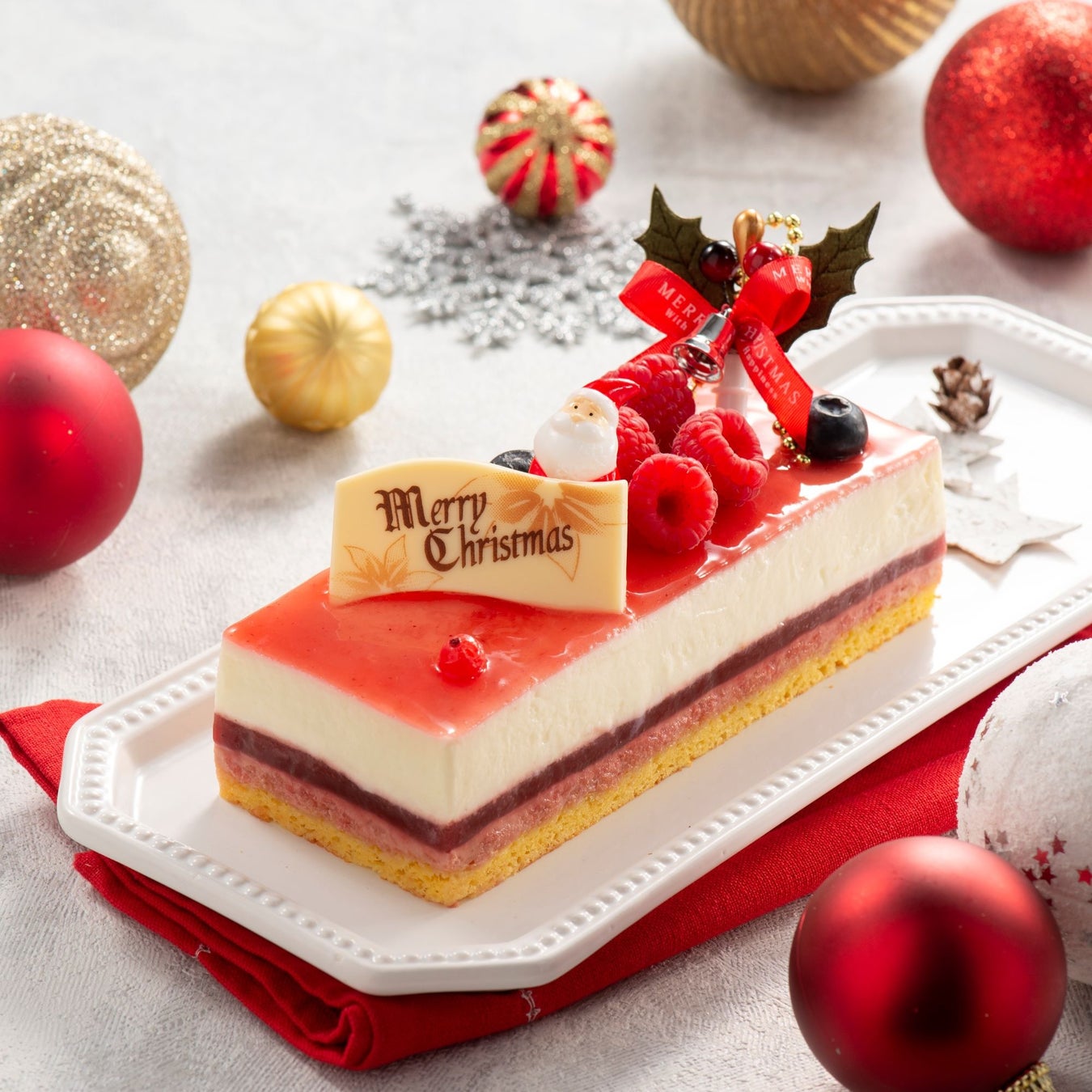 クリスマスの飾りをあしらった、見た目にも美しい、赤い果実のケーキ。