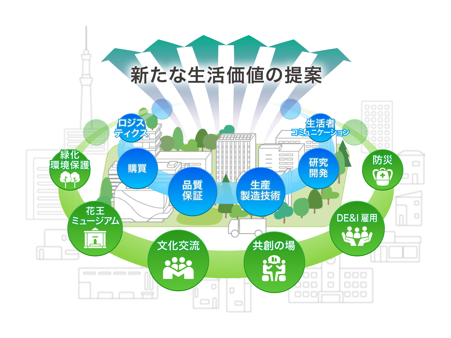 研究開発・事業・サプライチェーン・管理部門等が集結したすみだ事業場は、生活者に近い立地を活かして、地域に根ざして生活者をよりよく知る活動を一層強化し、各部門が連携して多様なニーズに対応した価値ある製品やサービスの創造に取り組んでいます。