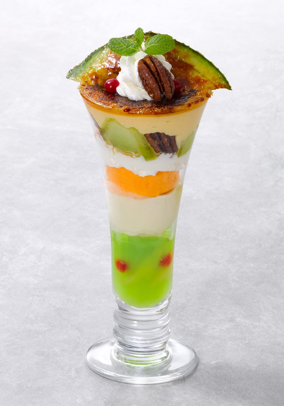 毎年大好評の「フレッシュメロンボウルパフェ」は、今年もメロン半分を贅沢に使用し、メロンのアイスやカシスアイス、メロンの果肉がぎゅっと詰まった一品です。メロンボウルの中のアイスや果汁はストローで最後まで存分に味わえます。さらに季節デザートの定番商品「焦がしメロンのブリュレパフェ」、「メロンのショートケーキ仕立て~アマレットの香り~」など、お好みに合わせて選べるラインアップをご用意しました。
