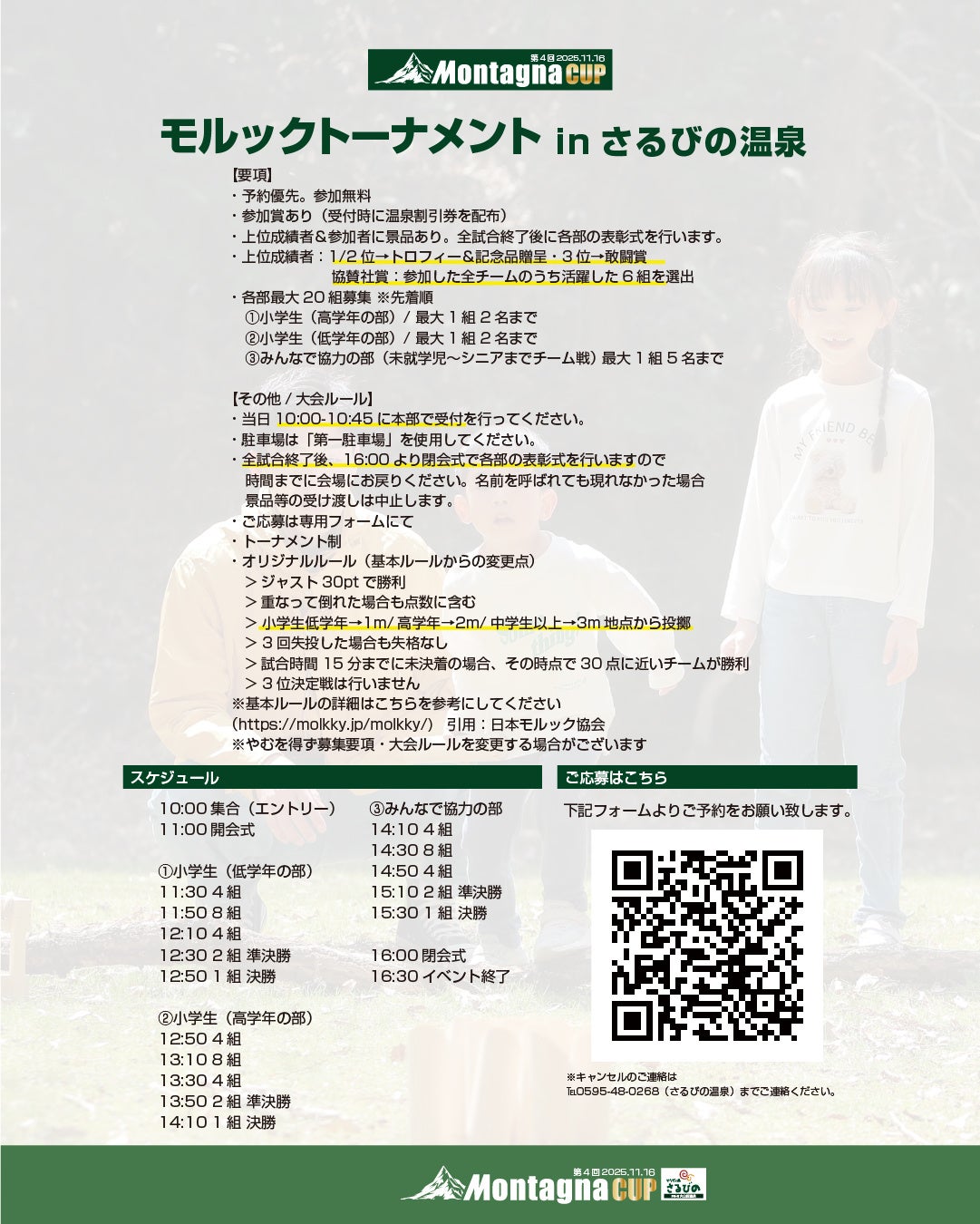 株式会社ハック(本社:大阪府東大阪市、代表取締役:有山哲也)が運営する、アウトドアブランド「Montagna(モンターナ)」と、大山田温泉さるびの(所在地:三重県伊賀市)は、アウトドアの魅力を広く発信する取り組みとして、2025年11月16日(日)に「モルックトーナメントinさるびの温泉」を開催します。