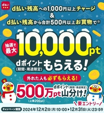 株式会社NTTドコモ(以下、ドコモ)は、「d払い®」アプリのd払い残高※1に1,000円以上チャージし、d払い残高から合計500円以上お買物をしたお客さまの中から抽選でdポイント(期間・用途限定)が当たる「d払い残高へのチャージ&d払い残高からのお買物でdポイントが抽選で最大10,000ptもらえる!外れた人も必ずもらえる500万pt山分け!キャンペーン」を2024年12月2日(月)から2024年12月31日(火)まで開催いたします。