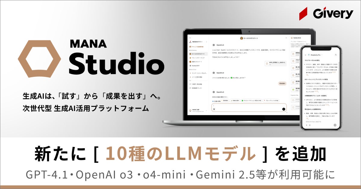 生成AIの企業活用およびDXを支援する株式会社ギブリー(本社:東京都渋谷区、代表取締役社長:井手高志、以下当社)は、2025年4月25日、提供する生成AI活用プラットフォーム「MANA Studio(マナ スタジオ)」にて、米OpenAIおよび、米Googleが発表した最新APIモデルへのアップデート対応が完了したことをお知らせします。