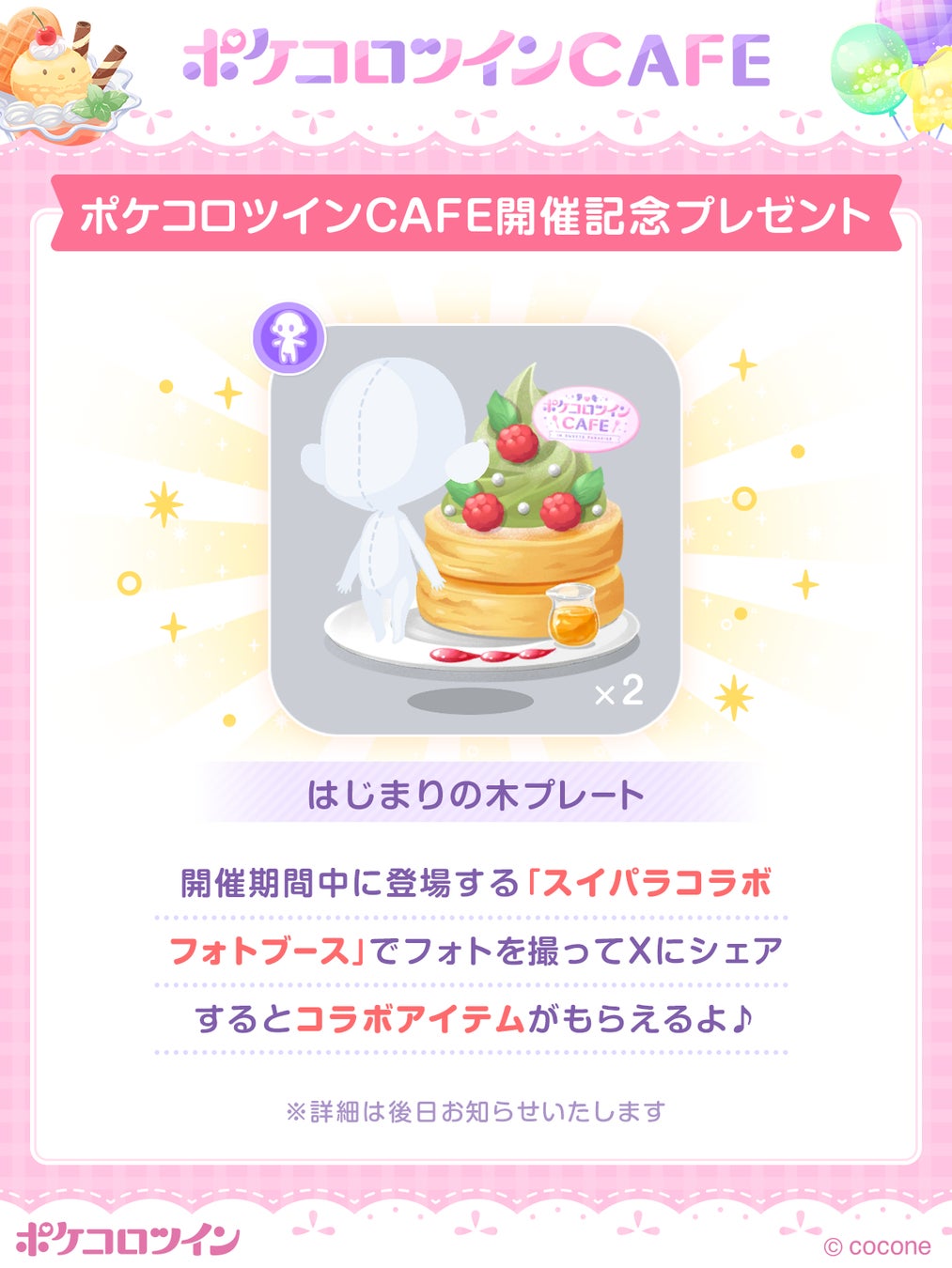 また、アプリ内にコラボ限定のフォトブースが登場し、「ココロン」がまるでコラボカフェを一緒に楽しんでいるようなフォトを撮ることができます。撮影したフォトをXに投稿し、スペシャルクエストをクリアすると、「ポケコロツインCAFE開催記念プレゼント」として、さらに特別なコラボアイテムが手に入ります。