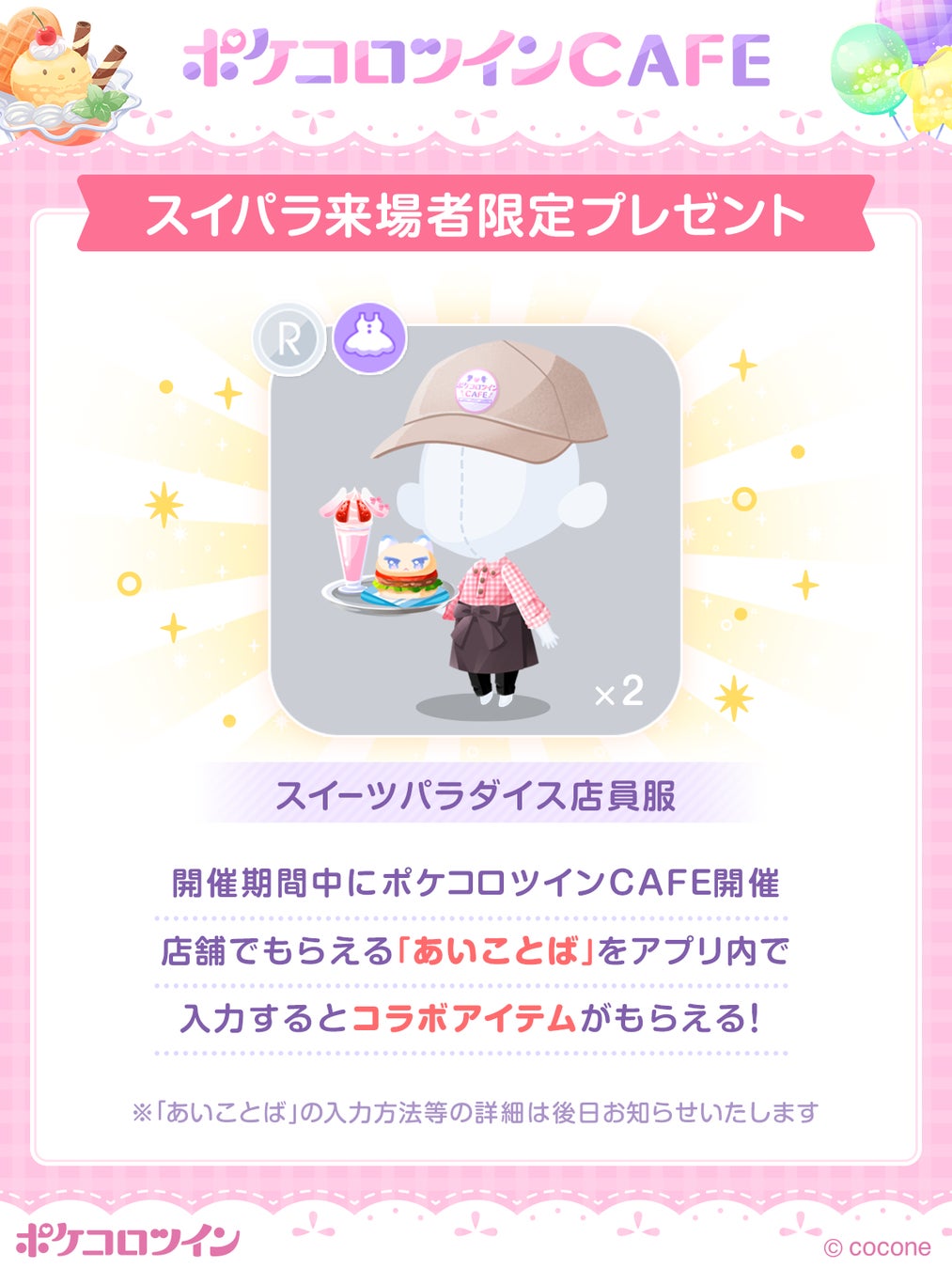 コラボ期間中、店舗で配布される「あいことば」をアプリ内で入力すると、「スイーツパラダイス」の店員服をイメージした来場者限定のコラボアイテムを獲得することができます。