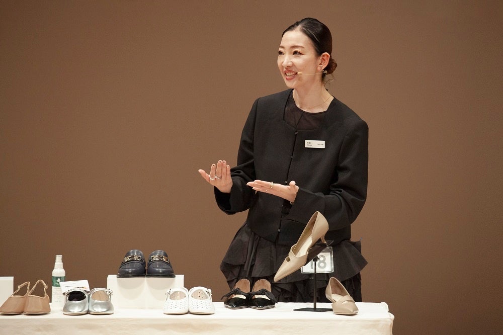 寺尾は2024年7月に開催された「渋谷ヒカリエ」大会において優勝、その後同 10月に行われた東京支部大会においても優勝し、全国大会への出場権を獲得しました。そして、全国大会では8分間の接客ロールプレイング審査において、社内異動を目前に控えたお客様から「雰囲気を変えたい、商談では取引相手に合わせて良いモノを身に付けていきたい」という要望を聞き出し、「新しい環境でぐっと背中を押すパートナー的なシューズを紹介します」と足元から気持ちを一新するようなパンプス2点を提案。異動間近で「気持ちが整ってくる時期ですね」と心情に寄り添い、お客様の印象を活かした服装やメイクのアドバイスも交え、新たなチャレンジを応援。さらに靴のケア用スプレーのご案内と自分は靴のケアも得意であることも伝え、今後につなげられるようなアピールも加えました。審査の結果、「ファッション・物販部門」で優勝。審査員から「立ち姿が素晴らしい。ブランドを体現していて、常にお客様中心。『自分が』ではなくお客様が何を求めているかを確実にとらえた、流れるような接客だった」という総評を得ました。