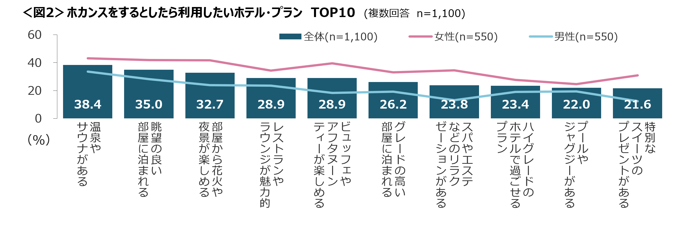 利用したいホテルやプランは「温泉やサウナがある」が最も高く、続いて「眺望の良い部屋」「花火や夜景が楽しめる」が上位にあがる。<図2>