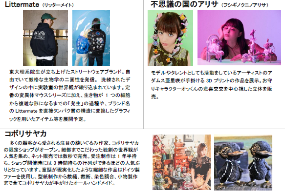当マーケットは、ディレクターに軍地彩弓を迎えた、最大80のクリエイターやブランドが毎月出品し、あらゆる才能との出会いが楽しめる場所です。売り場の空間演出には独創性に溢れた最先端のアーティストが参画。お客様に、いつ来ても、ここにしかない、新しい才能との出会いやリアルならではのショッピング体験をご提案すると同時に、様々な才能を持った方のクリエイションや個性の発揮を応援いたします。