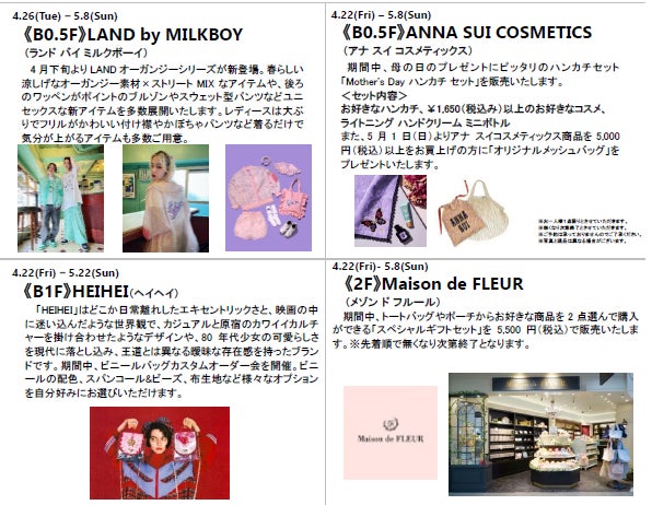 4月28日(木)には、B0.5Fに自主編集売場「愛と狂気のマーケット ~“おもしろい”才能の出会い系~」がオープン。国内で活躍する約70の出品者の作品やブランドが集結いたします。また、期間中、「ENVYM×PINK-latte」のスペシャルコラボストアや日本発セルフプレジャーブランド「iroha」のリミテッドストアなど、注目のPOP UP SHOPが多数登場いたします。さらに、「HEYUMM」と「Uiscel」初となる独立限定店舗「SENSE OF PLACE by URBAN RESEACH HARAJUKU LIMITED STORE」や、高円寺にある古着屋「7DAYS+(セブンデイズプラス)」などの店舗もオープン予定。