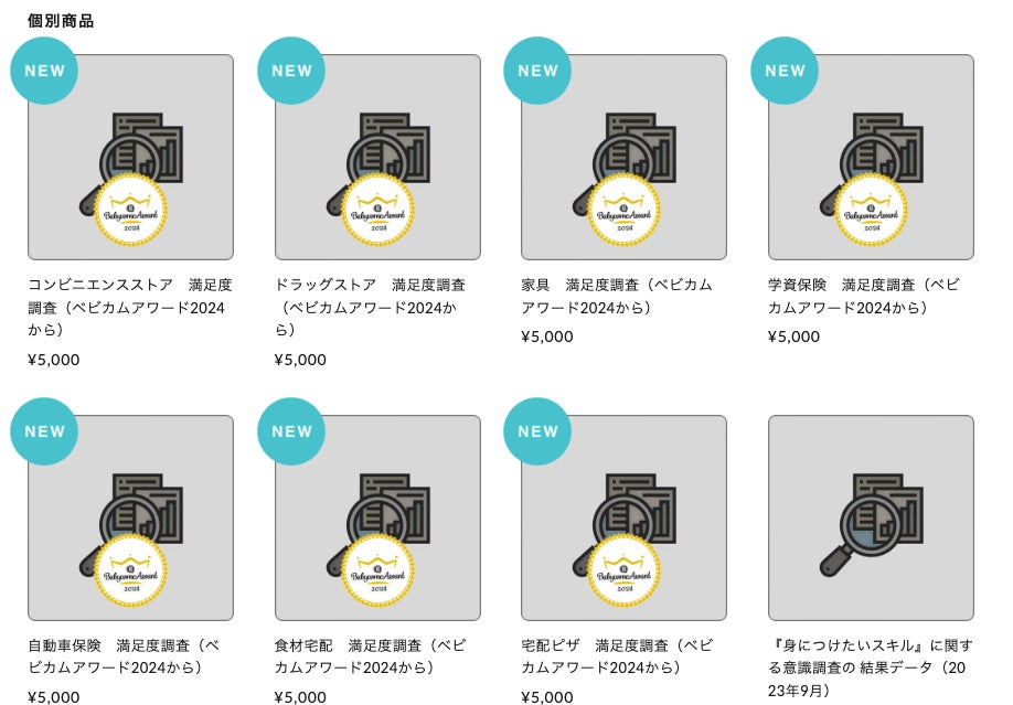 ベビカムに集まるママたちを対象に、昨年末に実施した、商品・サービスに対する満足度調査「ベビカムアワード2024」の全33ジャンルのうち、今回は第1弾として、ライフ部門の中から以下の7ジャンルのデータをピックアップし、リサーチデータ販売サイト「子育てボイス」から提供します。
