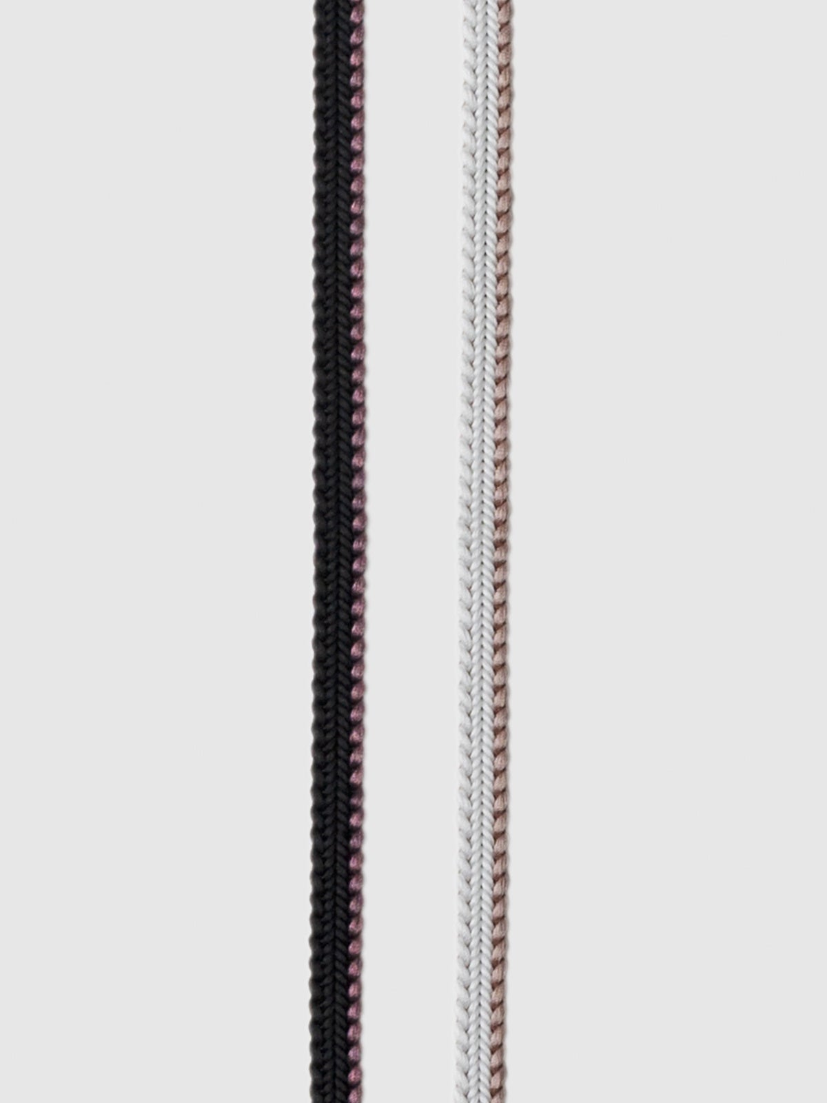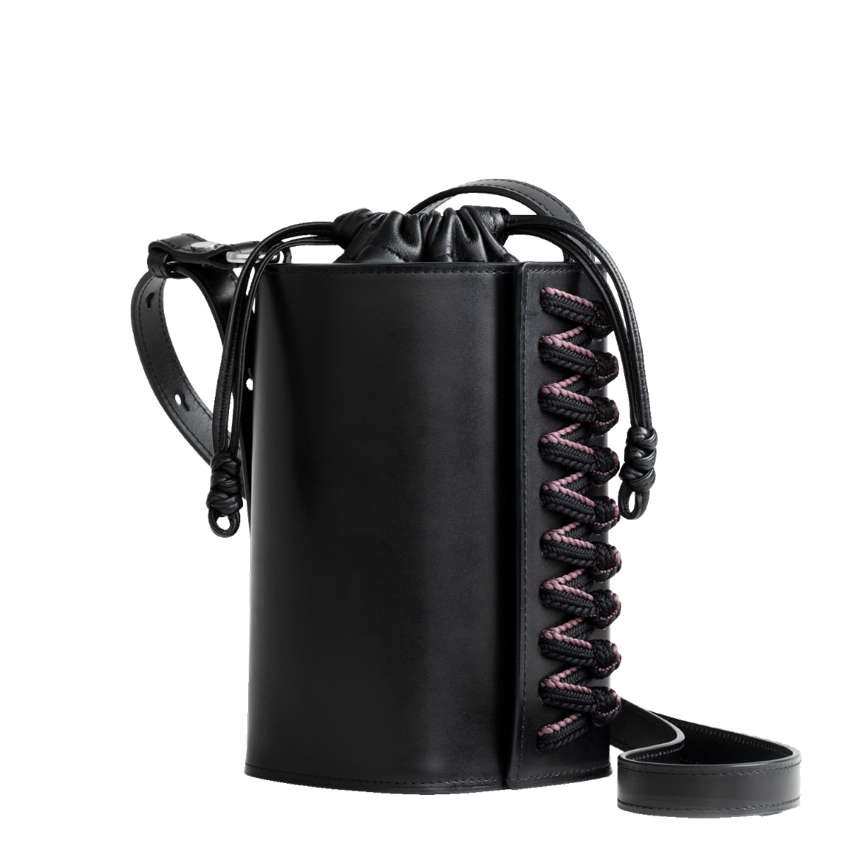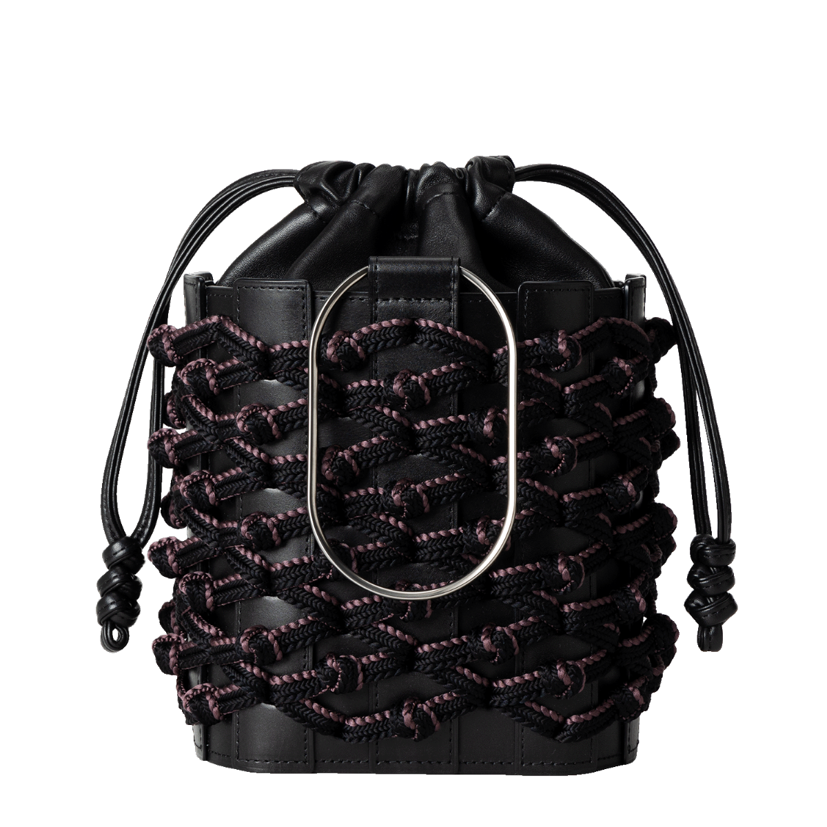 老舗組紐店「龍工房」が組紐の製作からバッグへ通していく作業を担い、組紐の種類の1つ「綾竹中四ツ目組」を採用。絹100%の正絹(しょうけん)の平紐で仕上げ、結びを入れることで生まれる陰影の豊かな表情と、シルクならではの高貴な質感が楽しめます。