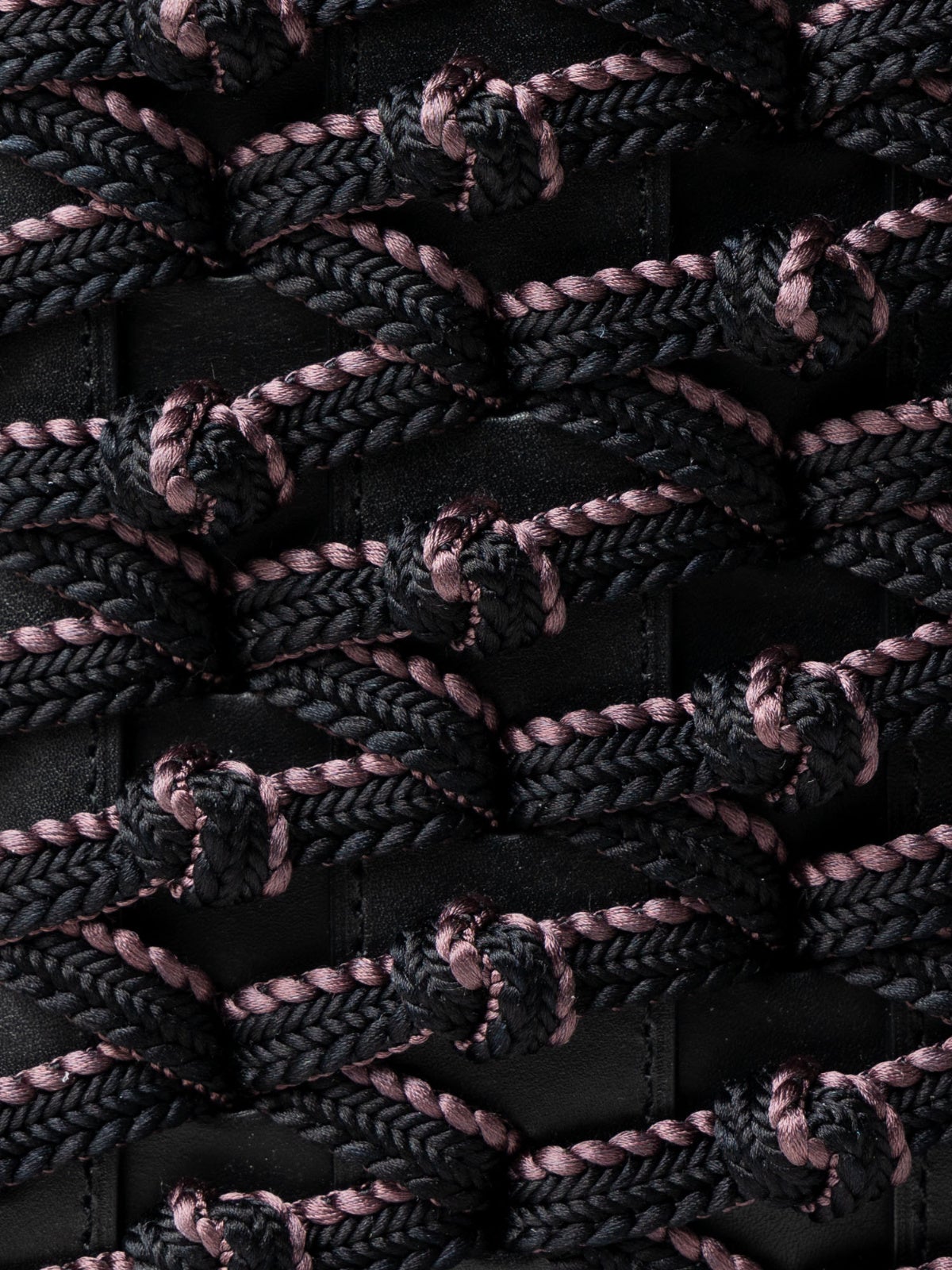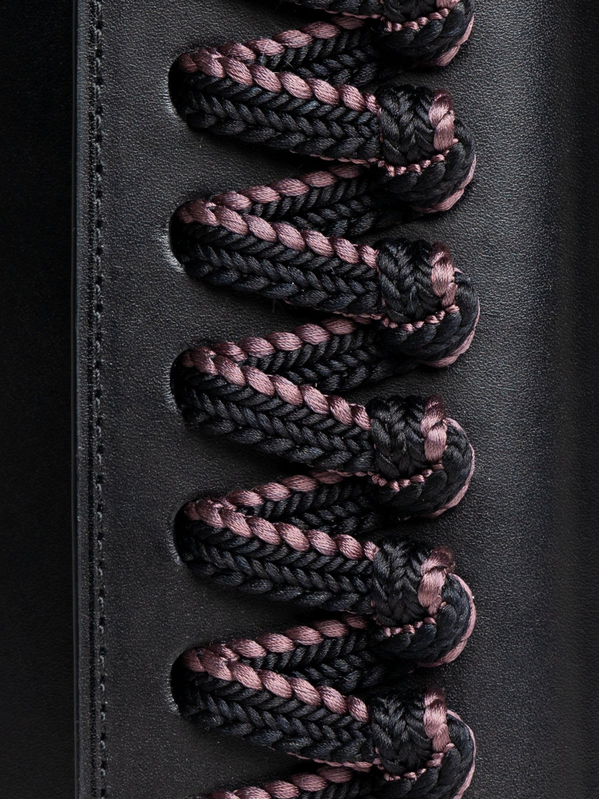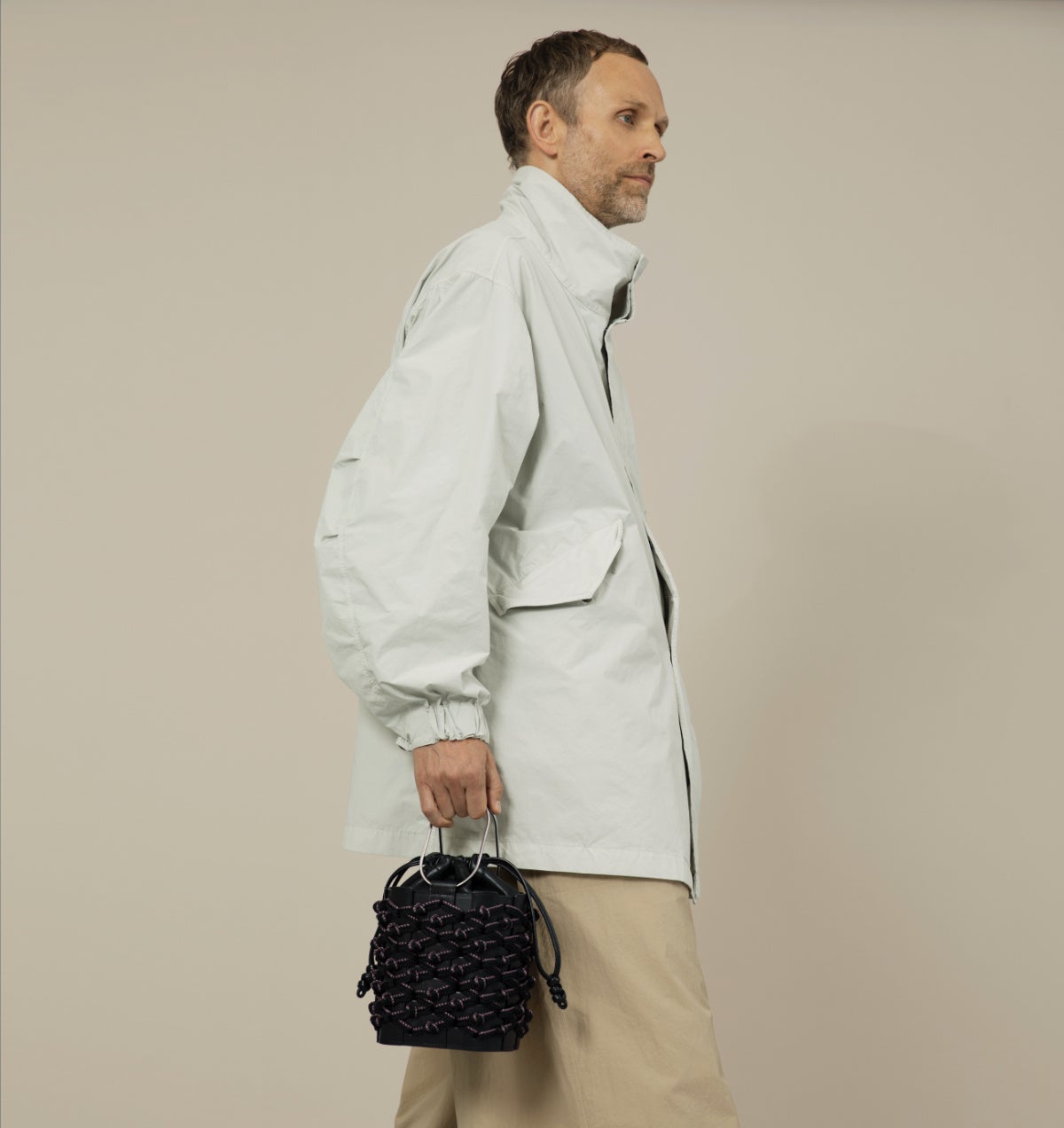 老舗組紐店「龍工房」が組紐の製作からバッグへ通していく作業を担い、組紐の種類の1つ「綾竹中四ツ目組」を採用。絹100%の正絹(しょうけん)の平紐で仕上げ、結びを入れることで生まれる陰影の豊かな表情と、シルクならではの高貴な質感が楽しめます。