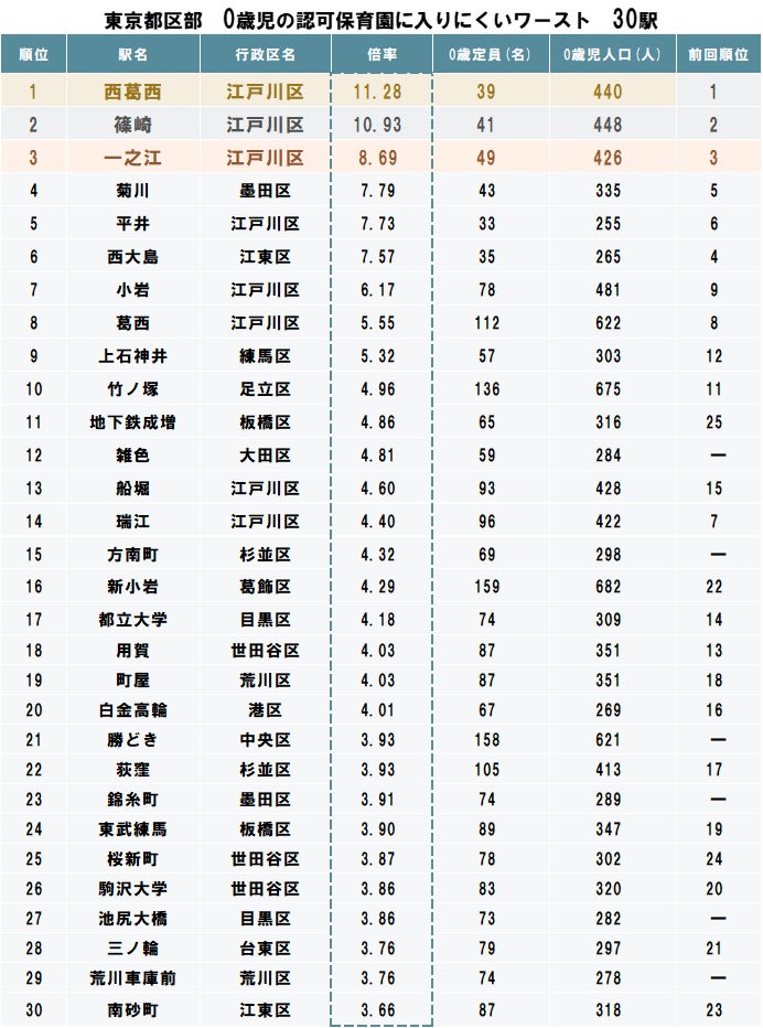■ 西葛西駅は2回連続でワースト1位となり、0歳児保育の需給逼迫が依然として顕著