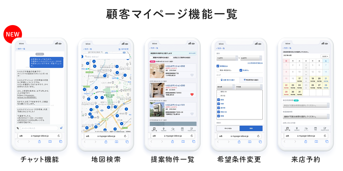 ・来店予約、希望条件変更、チャットなどが顧客マイページ上で完結