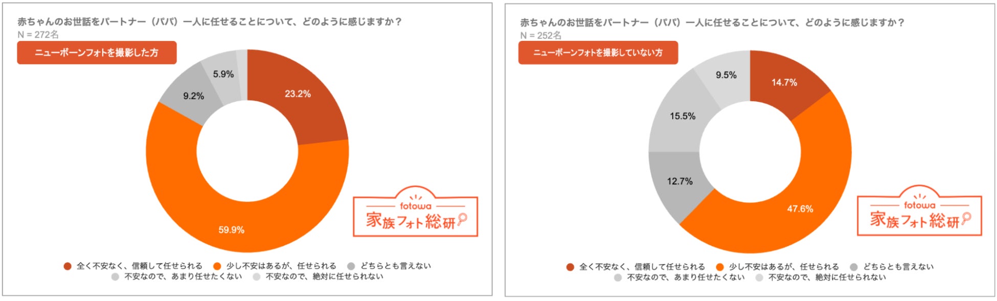 また、赤ちゃんのお世話をパパ一人に任せることについては、ニューボーンフォト撮影経験者のママの83.09%が任せられると回答。未経験者ママは62.3%となり、信用度も20.79ポイントも差がある結果になりました。