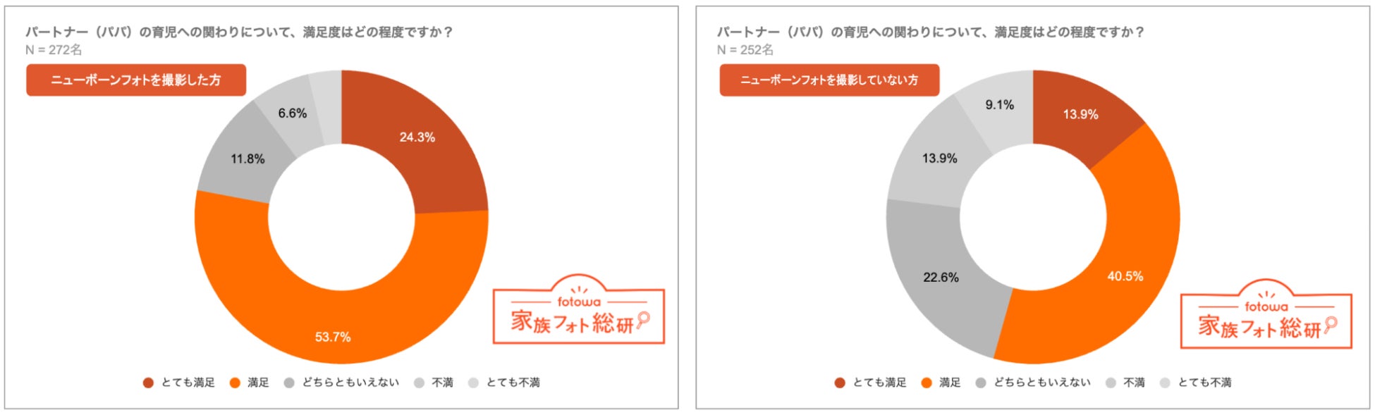 これらの結果から、ニューボーンフォトを撮影している家庭では、パパの育児への協力度が高く、ママの満足度も高い傾向があることがわかります。また、育児に積極的に関わるパパほどママの満足度も上がり、結果的にママからの信頼を得やすくなることも示されました。