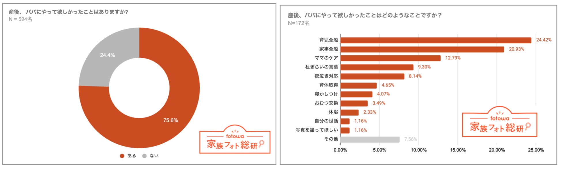 また、「産後、パパにしてほしいことがあった」と答えた人は75.57%で、具体的にして欲しいことで最も多かったのは、「育児全般」(24.42%)、次に「家事全般」(20.93%)、「ママのケア」(12.79%)となりました。