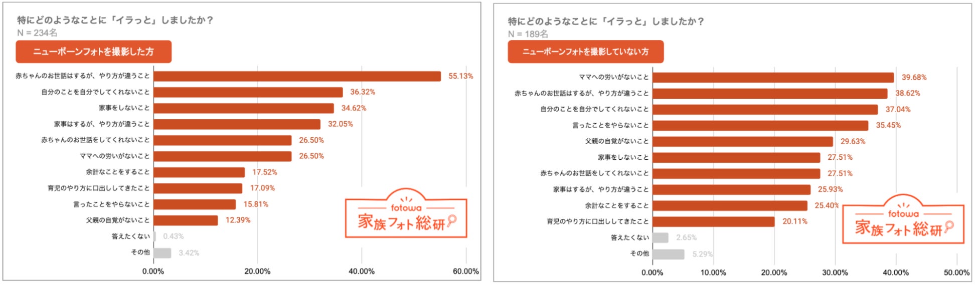 具体的にイラっとしたことを尋ねると、ニューボーンフォト撮影経験者のママは「赤ちゃんのお世話のやり方が違う」(55.13%)という回答が突出して多くなりました。一方、撮影未経験のママは「ママへの労いがない」(39.68%)で、その他の不満と大きな差はないものの、全体的に不満傾向にあることがわかります。