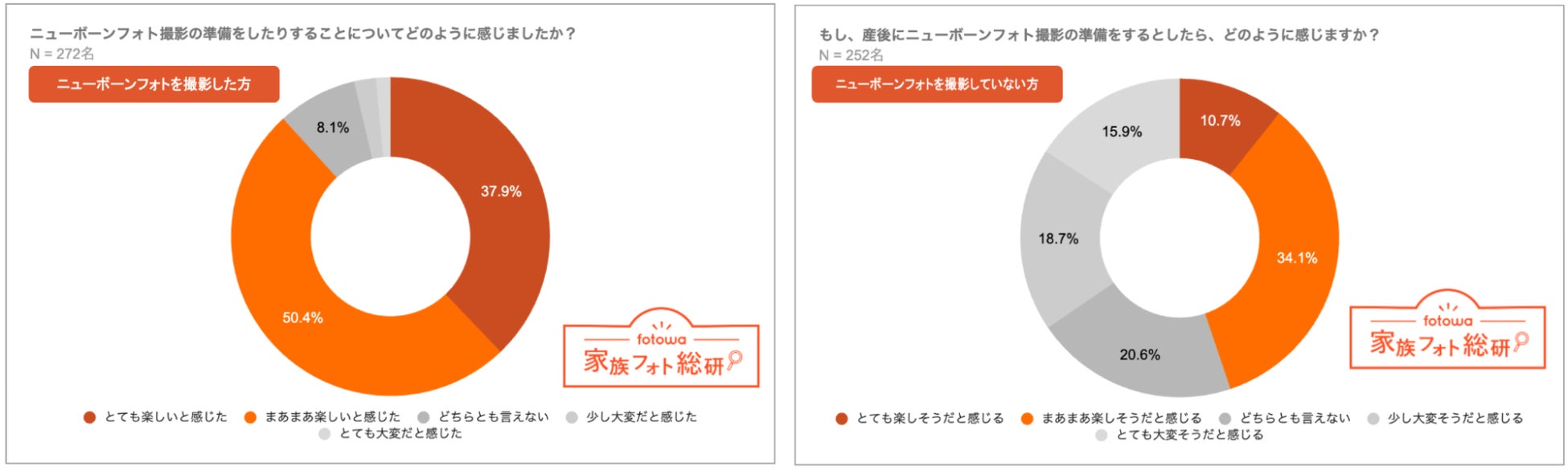 ニューボーンフォトの撮影準備についてどのように感じたかを伺うと、ニューボーンフォトを撮影した方では、9割近くが「とても楽しいと感じた」「まあまあ楽しいと感じた」と回答。大変だったと感じたのはわずか3.6%にとどまり、ほとんどの方がポジティブな気持ちで取り組んでいたことがわかりました。しかし、撮影しなかった方では、ポジティブに感じた方は半数以下の44.84%で、「大変そうだ」と感じた方は34.52%となりました。