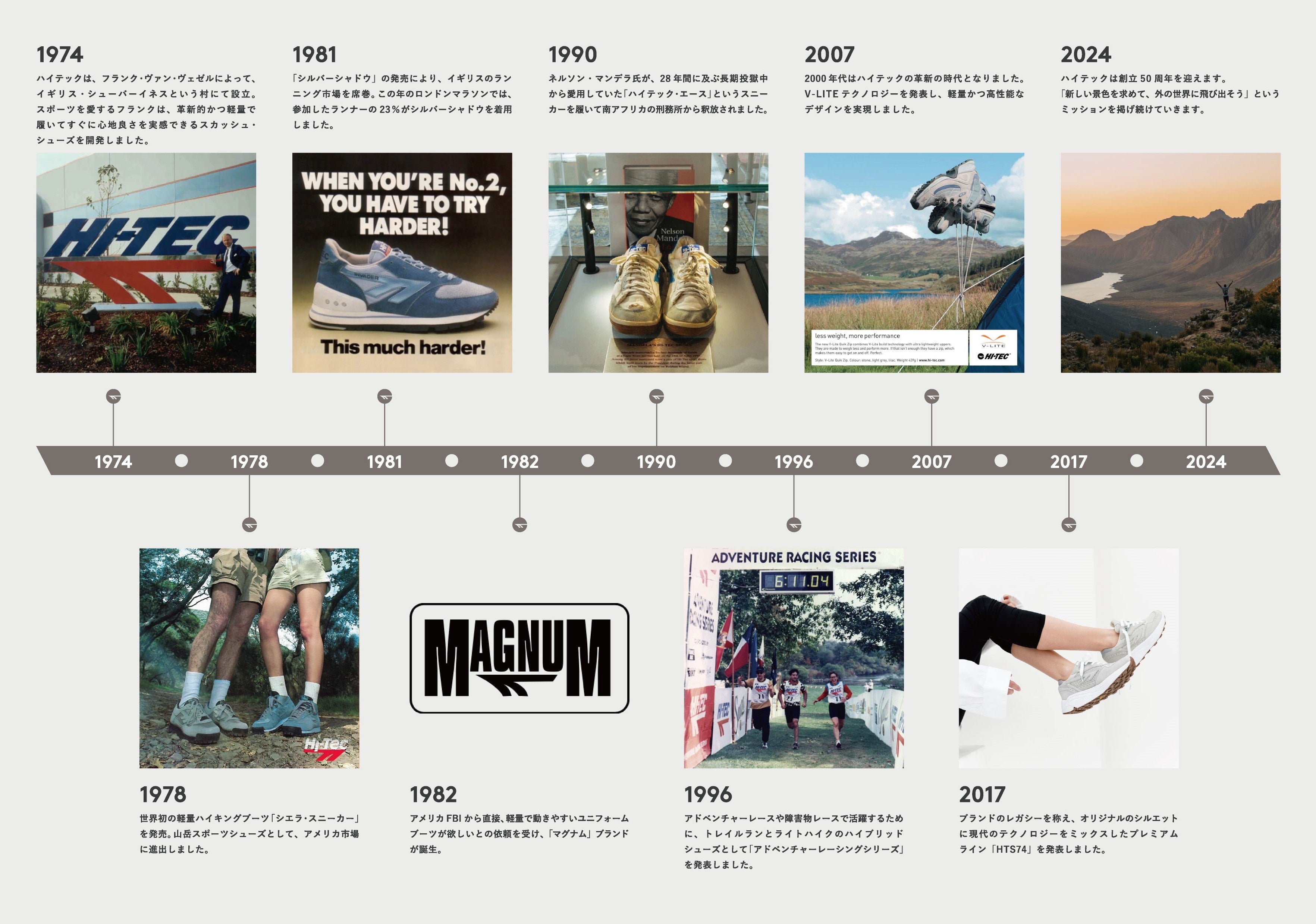HI-TECはスカッシュシューズをルーツとして、1974 年に英国で誕生しました。78年に発売したハイキングシューズ「シエラ」は、それまで重くて当たり前であったアウトドアシューズに“ 軽量” という概念を持ち込み人気に。アウトドアブームが到来しつつあった当時の日本でも大きな話題となりました。以来、ランニングシューズの開発やイギリス軍へのトレーニングシューズの支給など、創業から約半世紀に渡り世界各国のアウトドアファンに愛される名作を生み出しています。