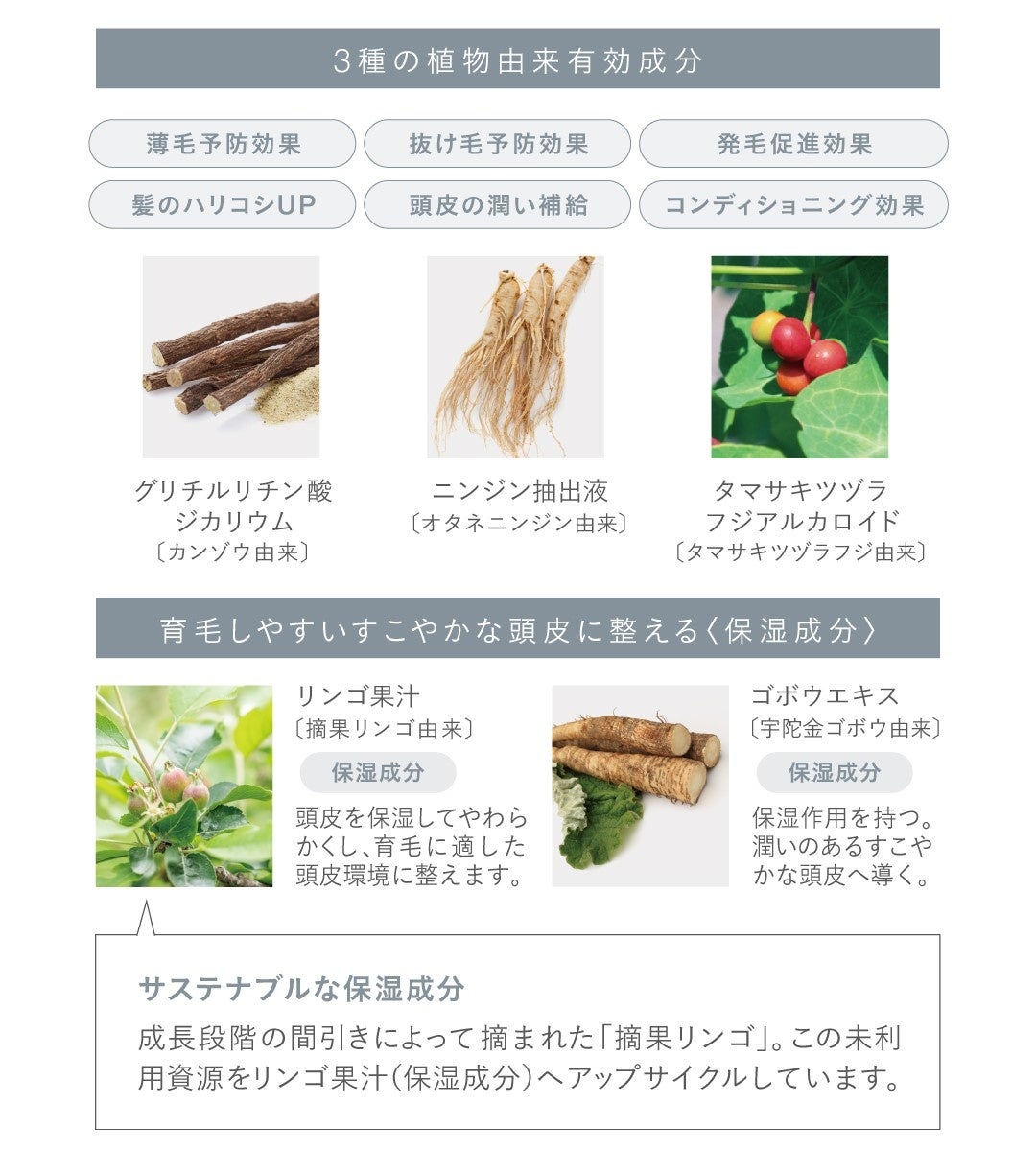 自然由来の3種の有効成分が、薄毛・抜け毛を防いで発毛を促進。ボリュームを感じる太く抜けにくい髪へと導きます。さらに保湿成分のリンゴ果汁とゴボウエキスが育毛しやすいすこやかな頭皮環境づくりをサポート。保湿することによって、フケやかゆみの予防にも役立ちます。