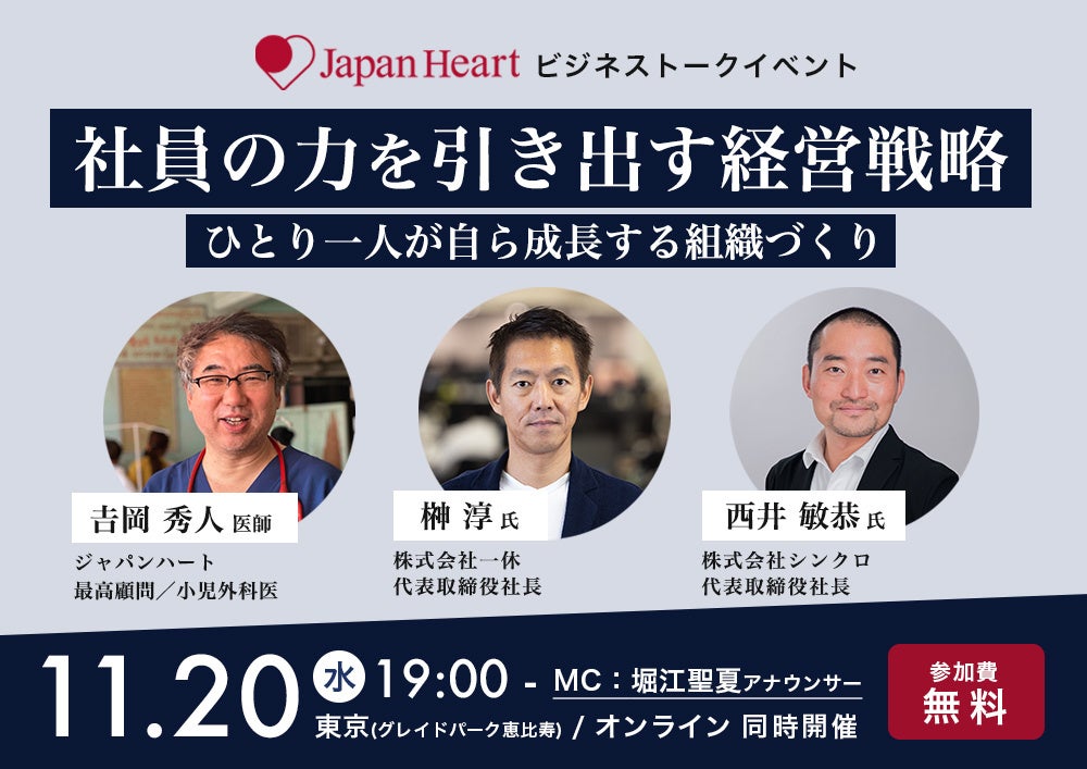 日本発祥の国際医療NGOである(認定)特定非営利活動法人ジャパンハート(東京都台東区 理事長:𠮷岡春菜)は、11月20日(水)19時00分よりビジネストークイベント『社員の力を引き出す経営戦略〜ひとり一人が自ら成長する組織づくり〜』を東京会場およびオンラインで同時開催することを決定しました。