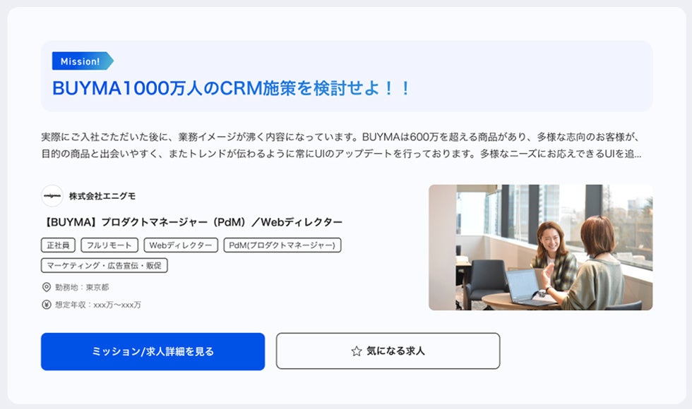 また、求人一覧ページもミッションが前面に出た形のUIUXになっており、ポジション独自でユニークなミッション設計をすることにより、他社と差別化した母集団形成も可能です。