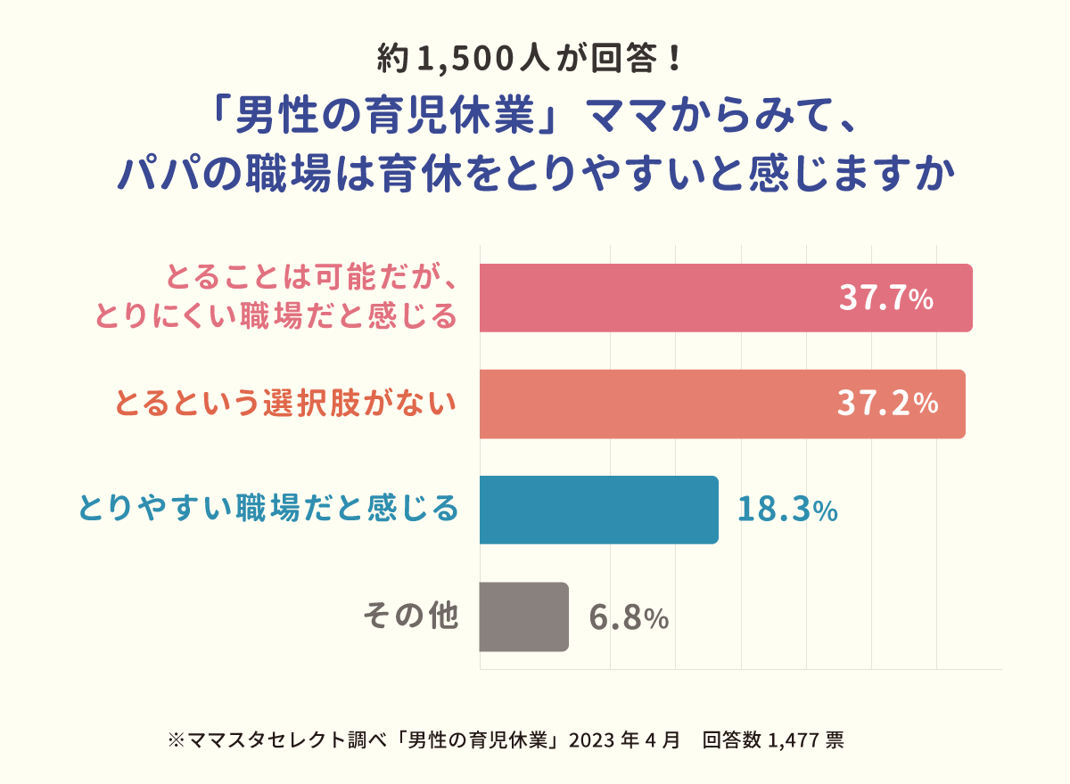 男性の育児休業取得率は依然として低く、令和元年の推移では女性の8割が取得するのに対し、男性は1割にも満たない状況です。今回ママスタセレクトでは「ママからみてパパの職場は育休をとりやすいと感じますか?」というアンケートを実施しました。「取りやすい職場だと感じる」「取ることは可能だが、取りにくい職場だと感じる」「育休を取る選択肢がない」「その他」を選択肢にしたところ、1,477票の回答が寄せられました。
