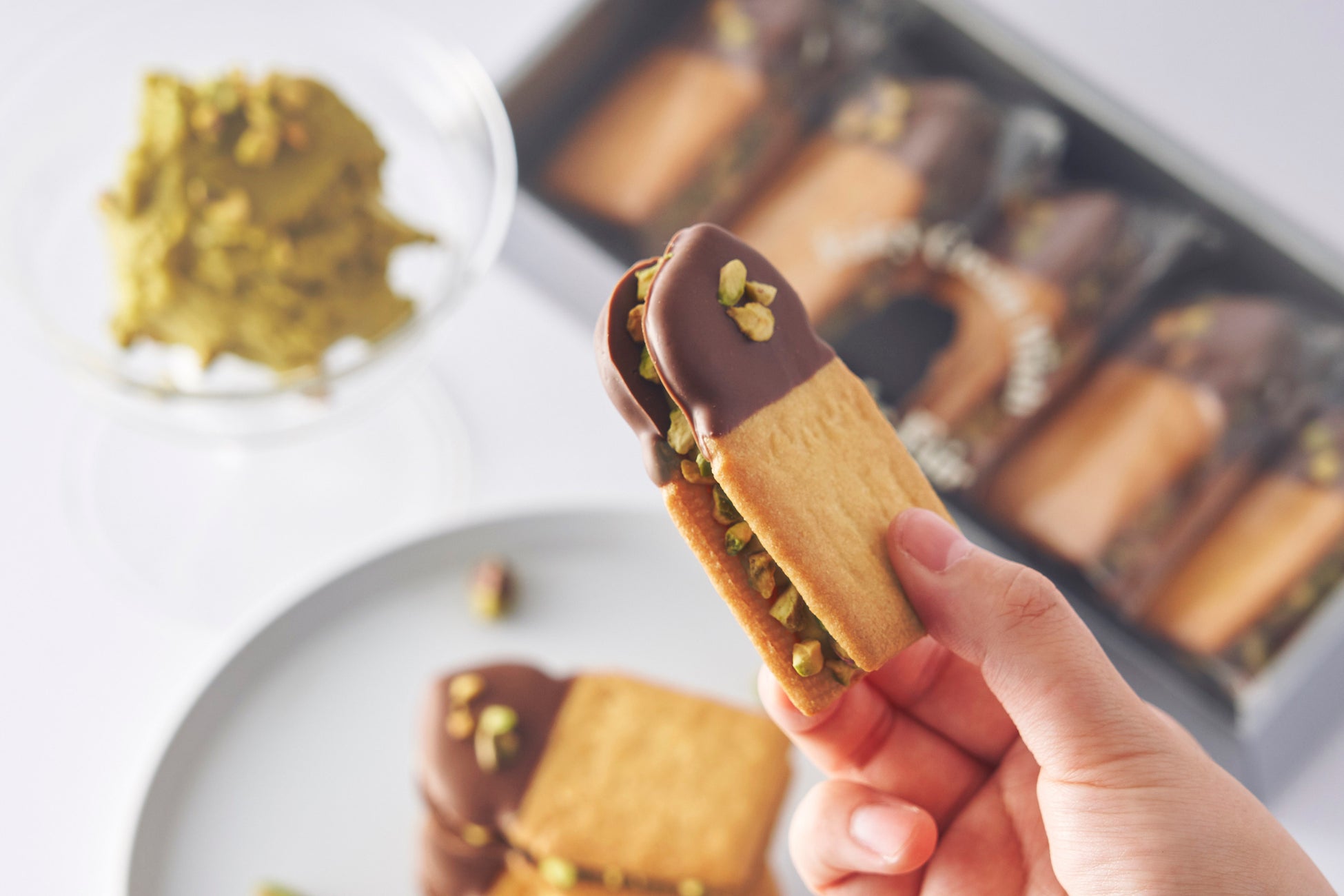 生クリーム入りのバタークリームに高品質なイタリア製ピスタチオペーストをたっぷりと混ぜ合わせ、ミルクチョコレートをかけたビスケットで挟みました。香ばしくローストしたピスタチオナッツを砕いてまぶし、食感と味のアクセントに。ナッツ本来の風味が口いっぱいに広がります。