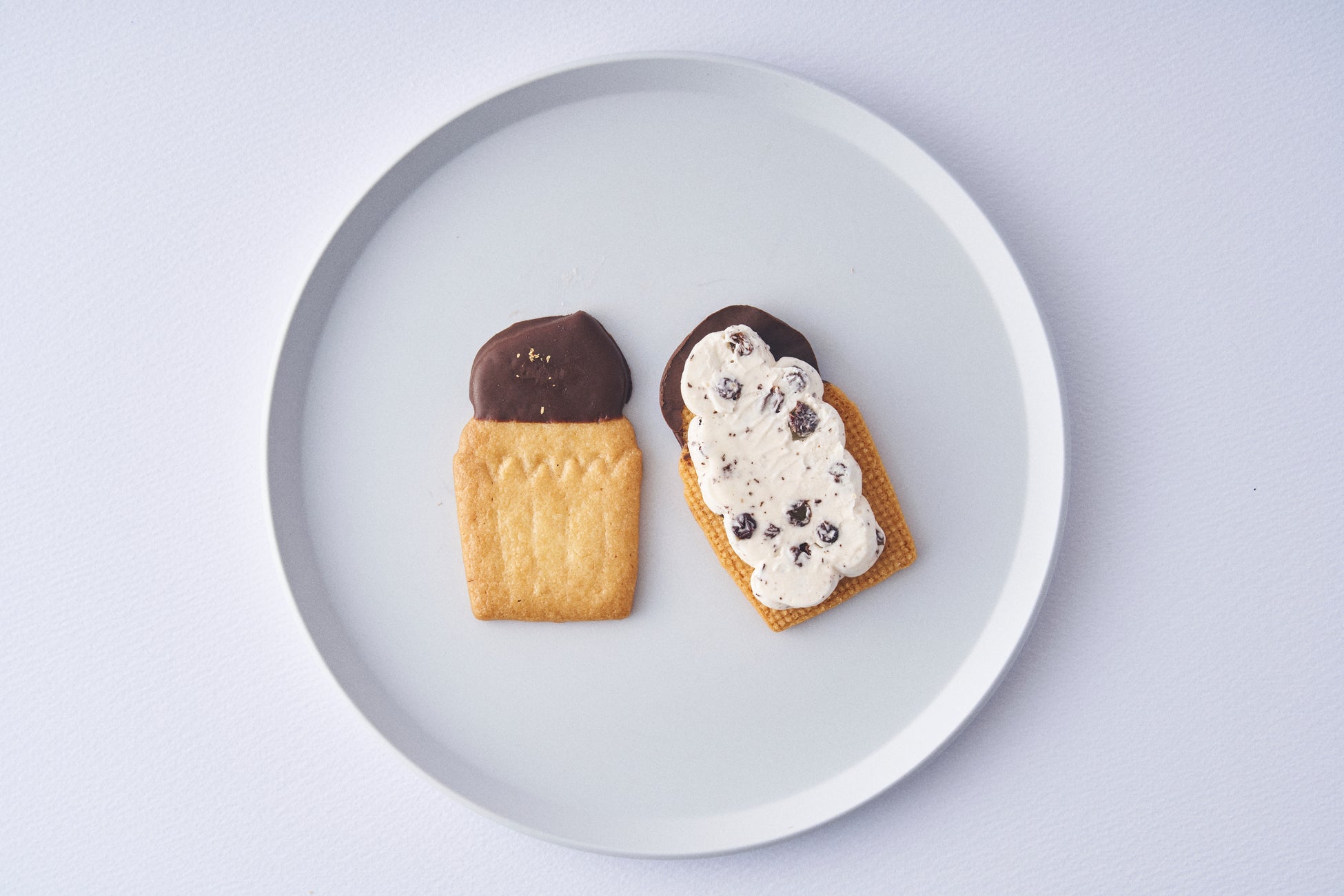 生クリーム入りのバタークリームに紅茶漬けレーズンを合わせ、ダークチョコレートをかけたビスケットで挟みました。冷んやりとろけるクリームにフルーティーな紅茶味のレーズンが馴染み、まるでミルクティーのような味わい。リピートしたくなるおいしさに評判があり、発売以来大人気のお菓子です。