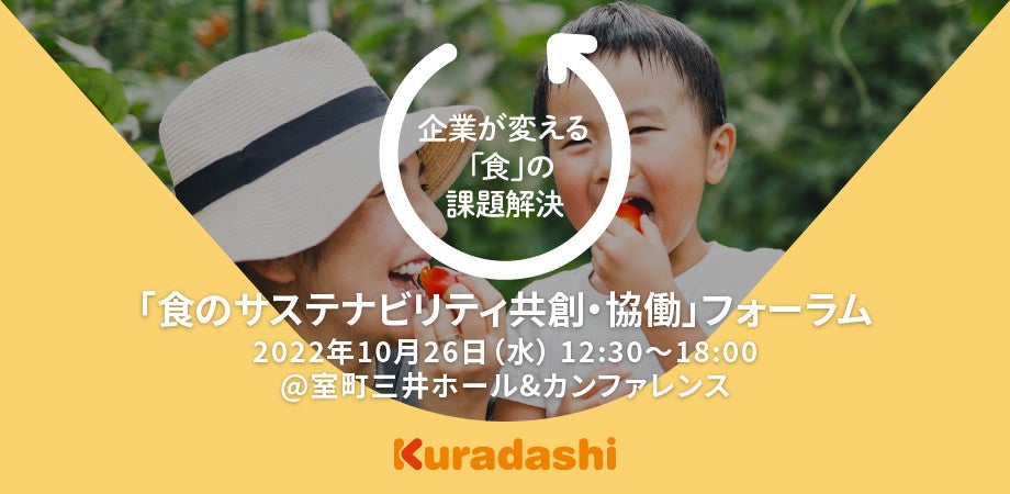 ソーシャルグッドマーケット「Kuradashi」を運営する株式会社クラダシ(本社:東京都品川区、代表取締役社長:関藤竜也、以下「クラダシ」)は、クラダシ初となるフォーラム「食のサステナビリティ共創・協働」フォーラムを10月26日(水)に開催いたします。本イベントでは、「食のサステナビリティ共創・協働」をテーマに、各界の最前線で活躍されている方々に、様々な食の課題における、協働事例をお話しいただくとともに、「食」の課題の認知向上と、「食」の課題解決に寄与する機会を提供いたします。