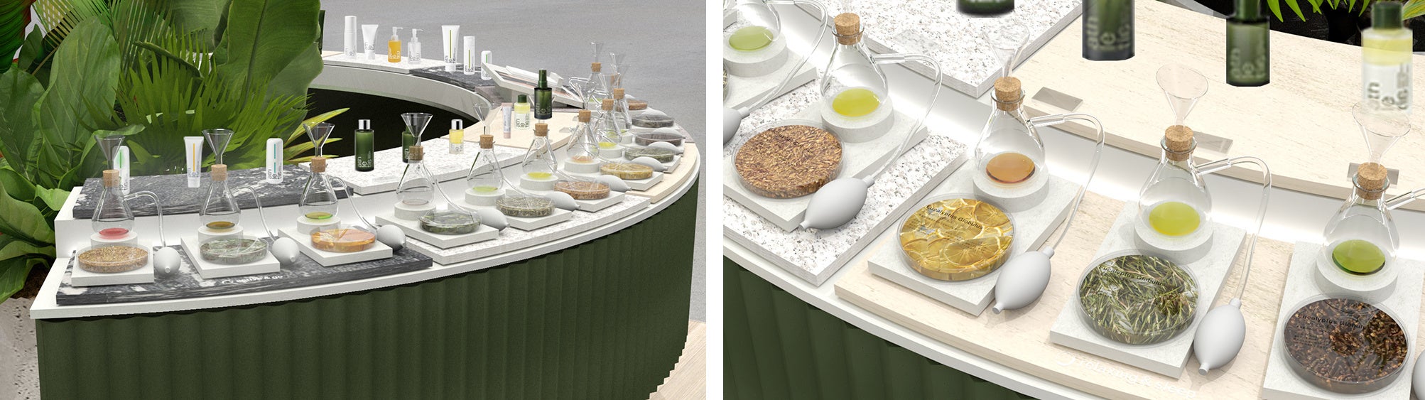 製品ごとに厳選して調香されている天然植物精油をドライ原料とともに展示し、独自の噴射システムにてお試しいただける香りのインスタレーションコーナーです。これにより「香りを楽しむ」だけでなく、「肌・からだ・心」に対して複合的にアプローチしているathletiaの香りのこだわりことを視覚と嗅覚を通じてお楽しみいただけます。