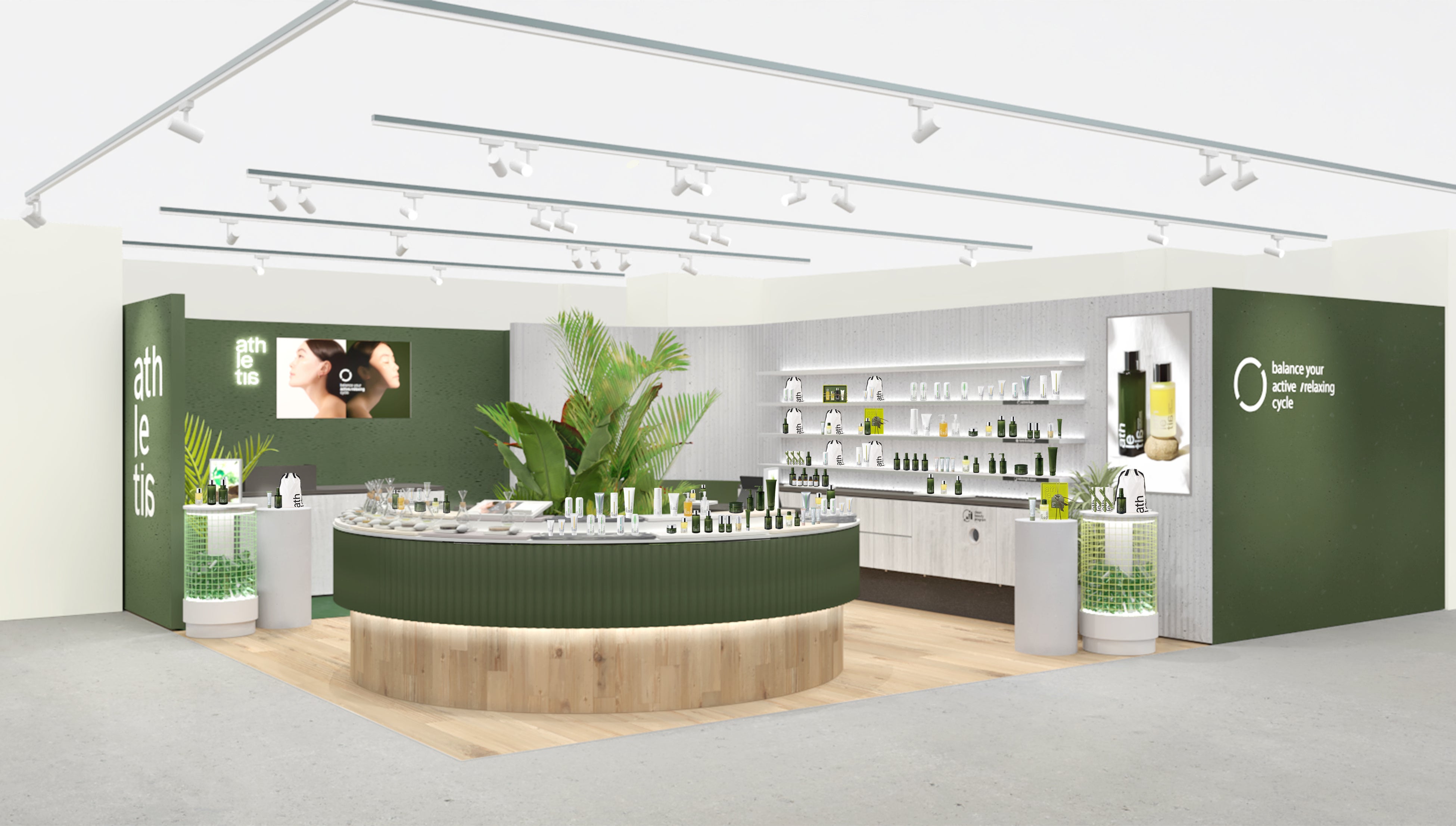今年から導入の新店舗デザインは最新のブランドコンセプトを踏襲し、「循環」、「体幹」、「都会のライフシ ーン」の3つのキーワードを軸に設計。店内をアクティブゾーン(動く)とリラックスゾーン(休む)に分け、中心に「体幹」を表現する円型什器を設けて、athletia 製品を試しながら店内の2つのゾーンを回遊することで「循環」をお買い物中にもご体感いただけるレイアウトです。