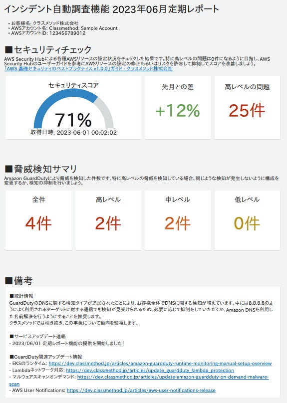 また、本機能には月次で発行する定期レポート機能が付属しています。定期レポート機能ではAWS Security Hubのスコアやその前月比、Amazon GuardDutyの検知状況などがレポートされます。いざというときの対応だけでなく、定常的なAWSセキュリティの維持状況を確認するエグゼクティブサマリとして活用できます。