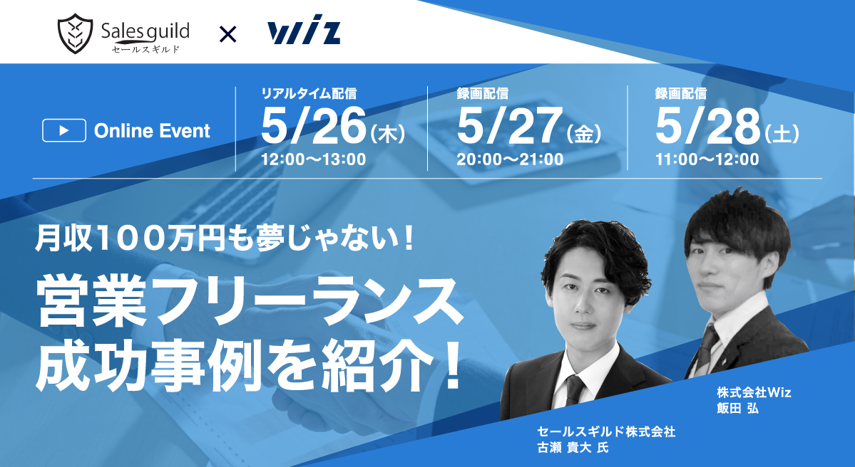 5月26日(木)、27日(金)、28日(土)※、Wizは【セールスギルド株式会社 代表取締役 古瀬 貴大氏】をお迎えして、無料オンラインセミナー【月収100万円も夢じゃない!営業職の新しい選択肢「営業フリーランス」の成功事例を教えます!】を開催します。